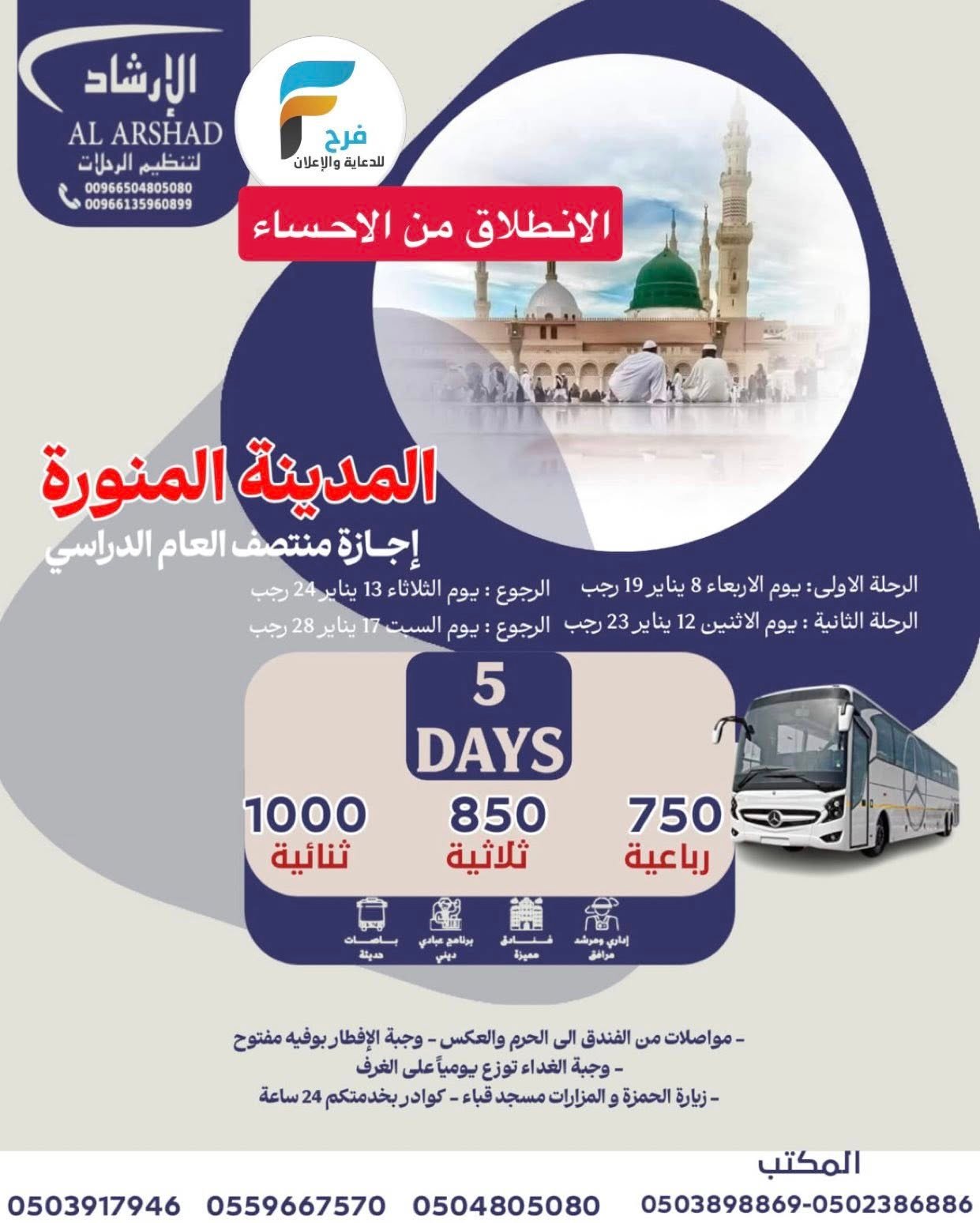 270 ريال تبدأ رحلات وكالة الارشاد إجازة منتصف العام / العمرة الرجبية – المدينة المنورة 20 ديسمبر، 2025 525/12/20للحجز والاستفسار:حجي الحمدان ابو أحمد0504805080المكتب0135960899الدمام / القطيف05596675700502386886050389886905031153360503917946أشترك معنا في خدمة فرح :