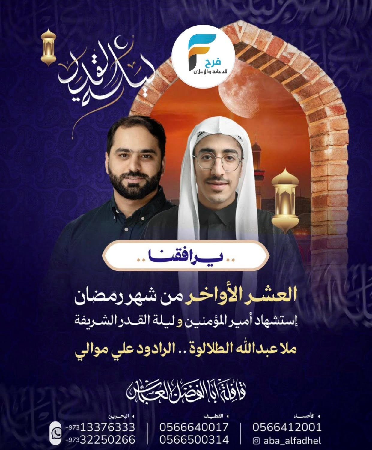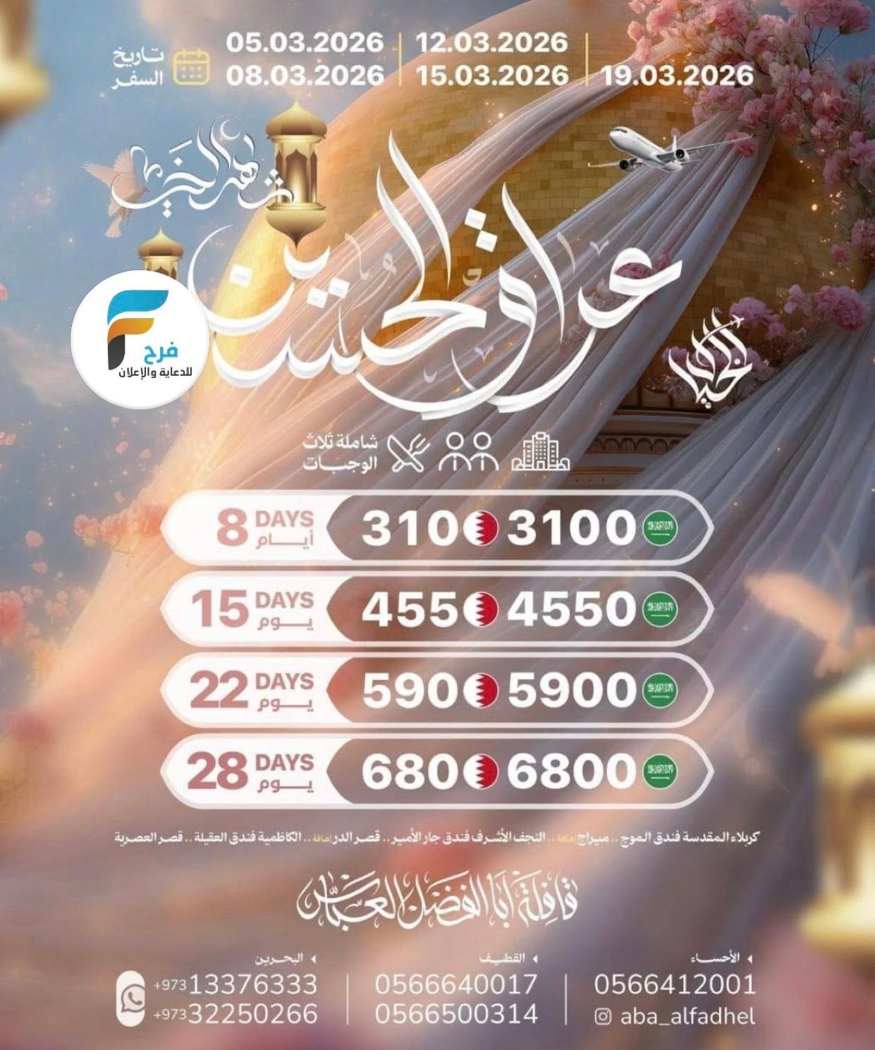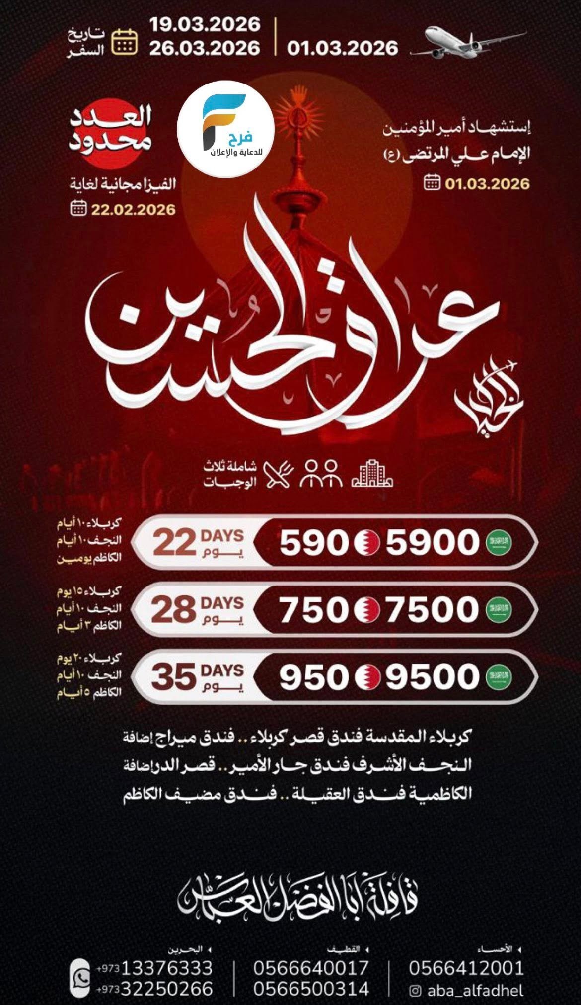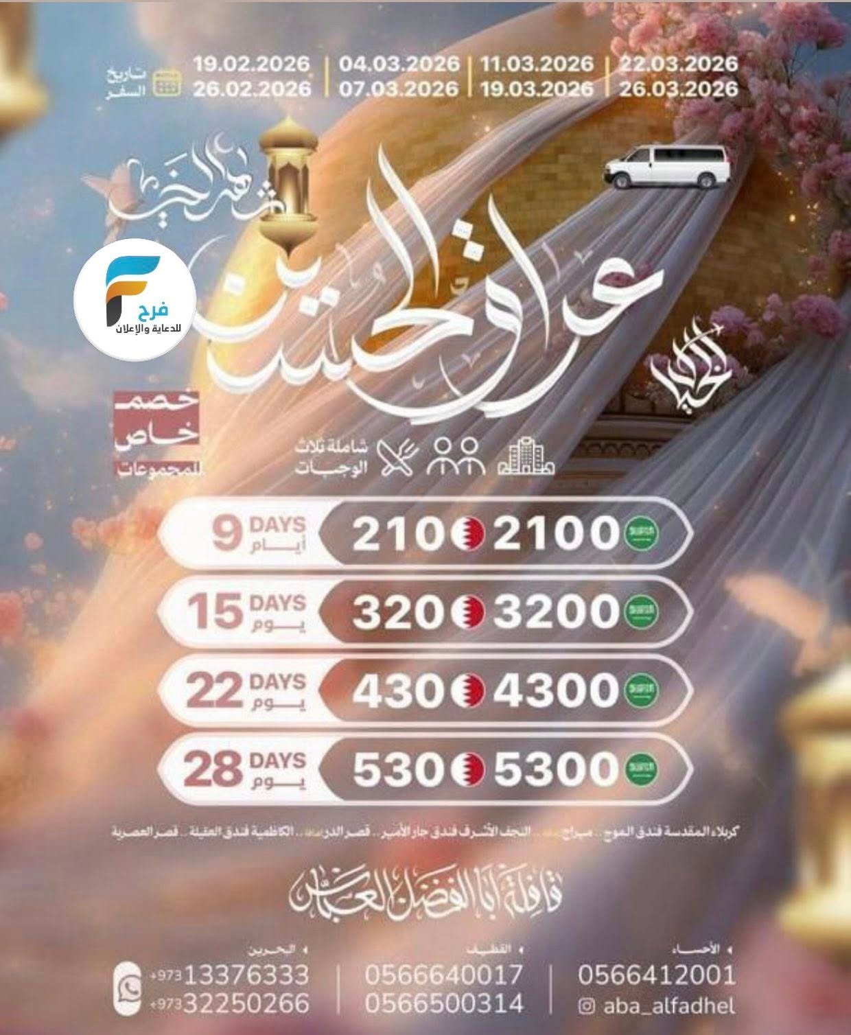2100 ريال تبدأ رحلات الحافلات والطيران قافلة ابا الفضل العباس شهر رمضان / العراق 21 فبراير، 2026225/12/09للحجز أو الاستفسار :القطيف:05583352970566500314056664001705446964770566285623الاحساء:05664120010501908993البحرين:00973133763330097332250266انستغرام :Aba_alfadhelفيس بوك / قافلة ابا الفضل العباس سناب /https://www.snapchat.comأشترك معنا في خدمة فرح :