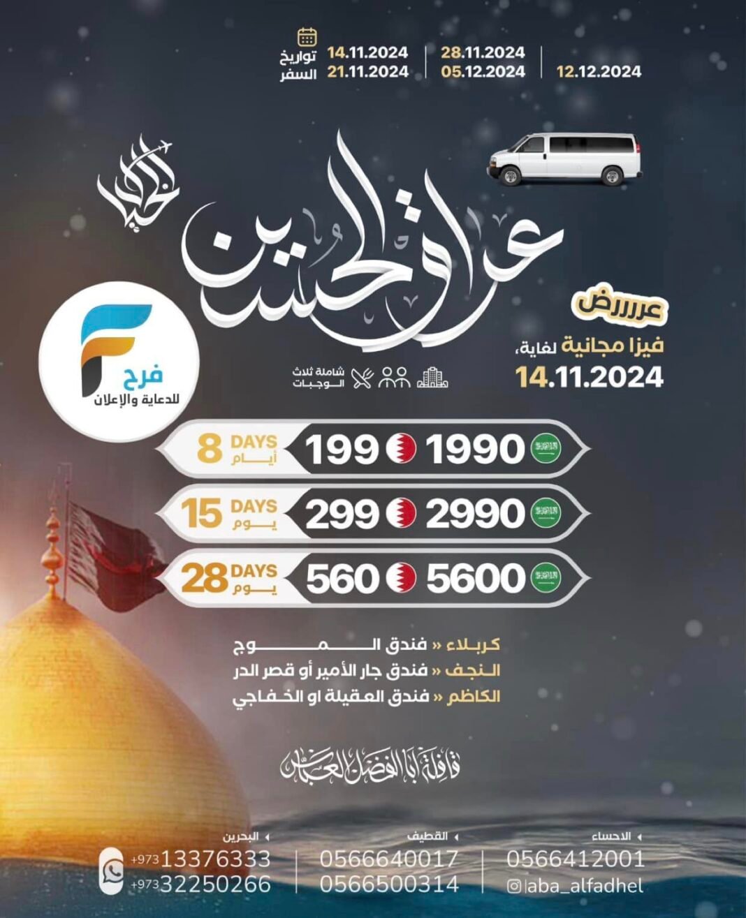 490 تبدأ رحلات الحافلات والطيران قافلة ابا الفضل العباس / العراق – الرياض 7 نوفمبر، 20249للحجز أو الاستفسار :القطيف:0566500314056664001705446964770566285623الاحساء:05664120010501908993البحرين:00973133763330097332250266انستغرام :Aba_alfadhelفيس بوك / قافلة ابا الفضل العباس سناب /https://www.snapchat.comأشترك معنا في خدمة فرح :