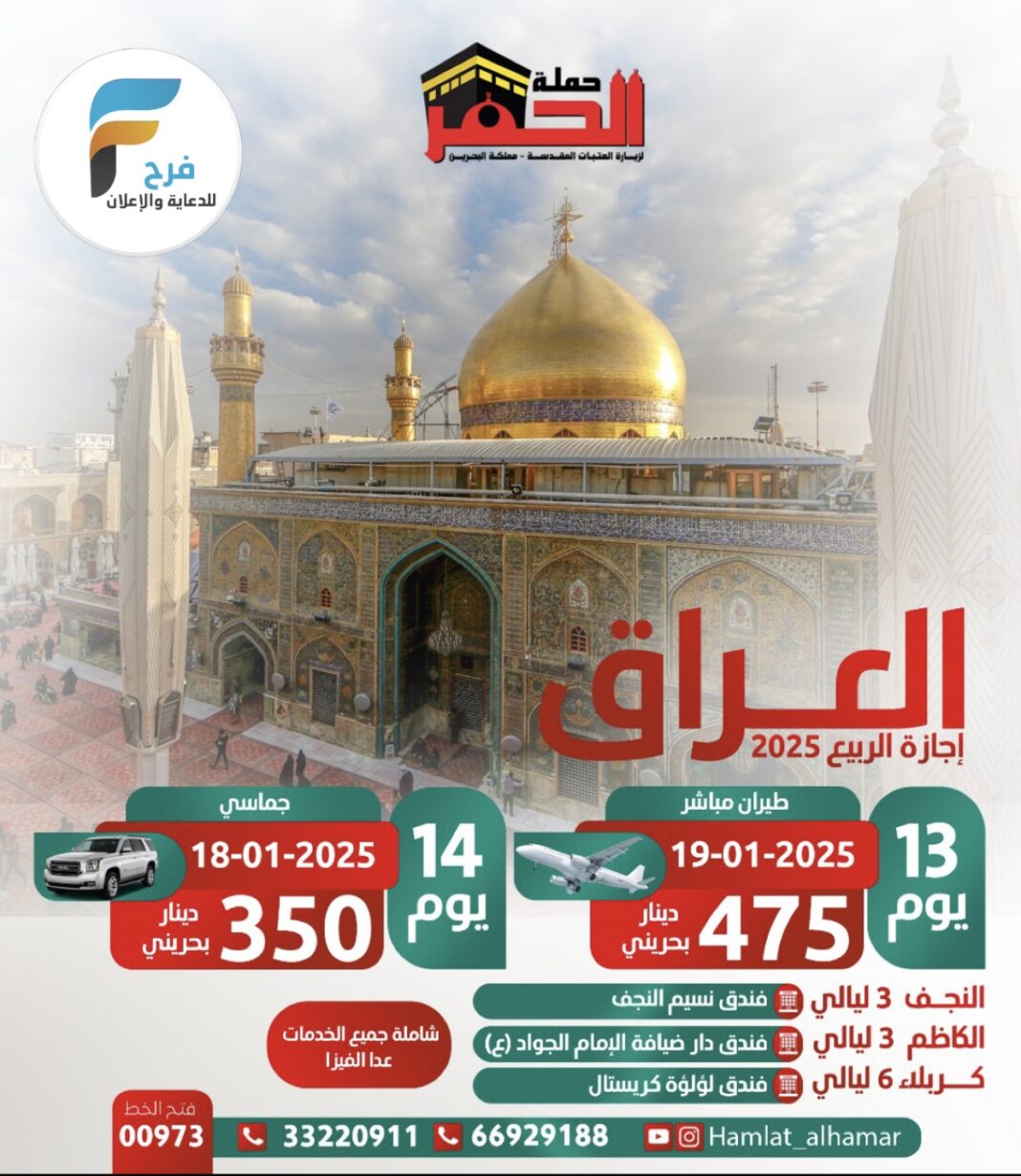 2200 ريال تبدأ رحلات الحافلات والطيران حملة الحمر / العراق 15 يناير، 2025 1 للحجز والاستفسار :- 0097366929188 0097333220911 0097338830911 0097317162456 انستقرام: www.instagram.com أشترك معنا في خدمة فرح : Enter the text or HTML code here شارك هذا الموضوع: النقر للمشاركة على X (فتح في نافذة جديدة) X انقر للمشاركة على فيسبوك (فتح في نافذة جديدة) فيس بوك معجب بهذه:إعجاب تحميل... مرتبط