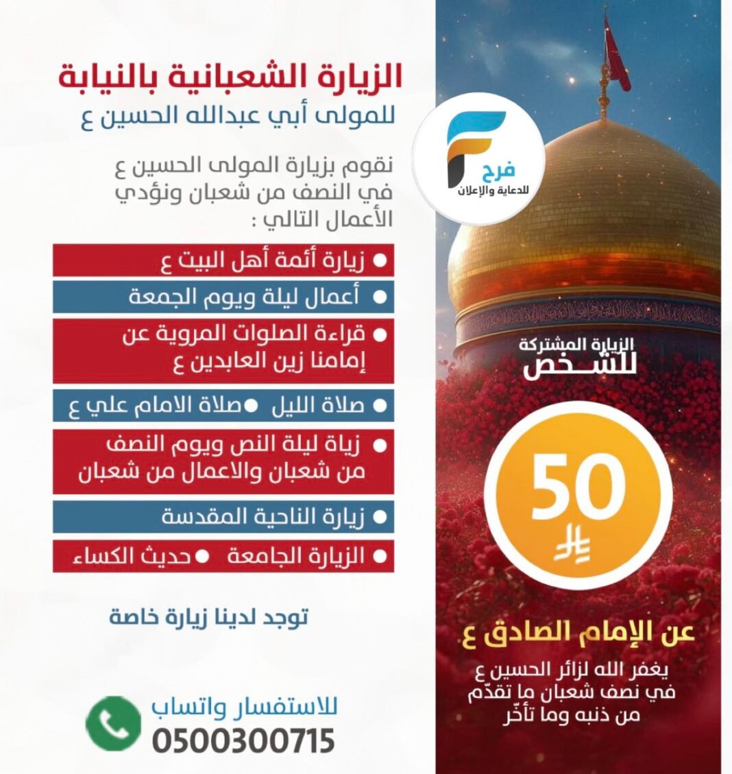 50 ريال قيمة الأعمال النيابة للزيارة الشعبانية 24 يناير، 2026 1 للحجز أو الاستفسار : 0500300715 أشترك معنا في خدمة فرح :