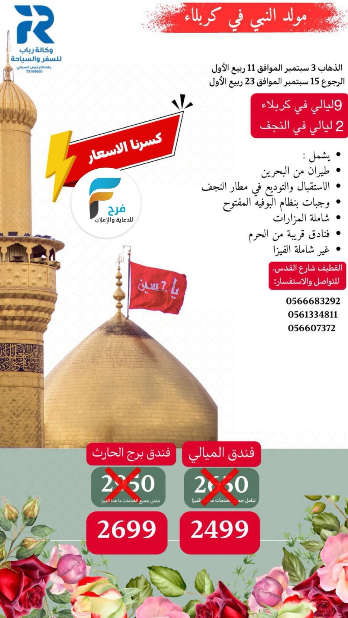 999 ريال تبدأ تذاكر ورحلات وكالة رباب للسفر والسياحة مولد النبي ص / العراق 28 أغسطس، 2025 لم 1ب ق 500للحجز والإستفسار :0542245673056667327205613348110566683292انستقرام www.instagram.comسناب شاتwww.snapchat.comأشترك معنا في خدمة فرح :