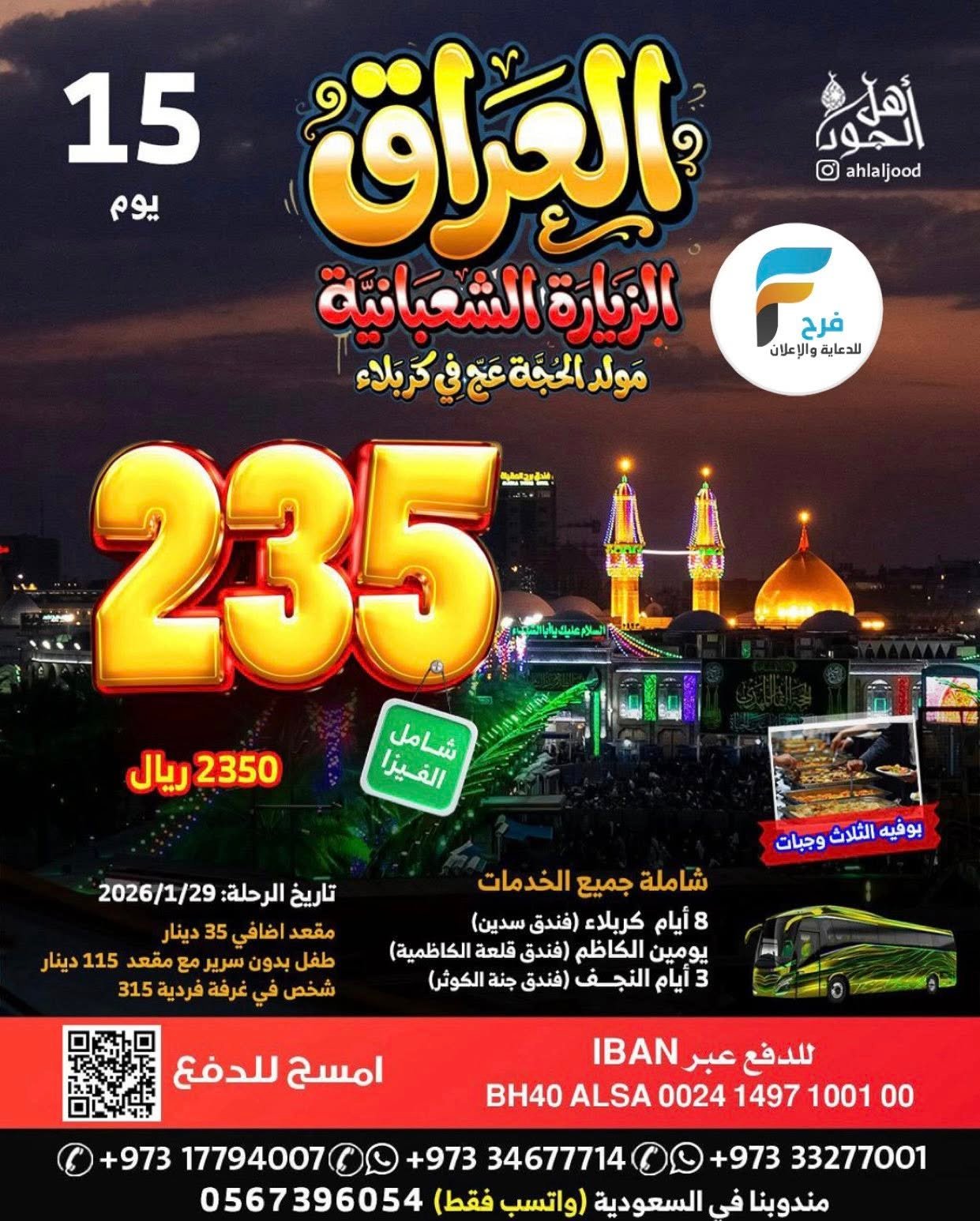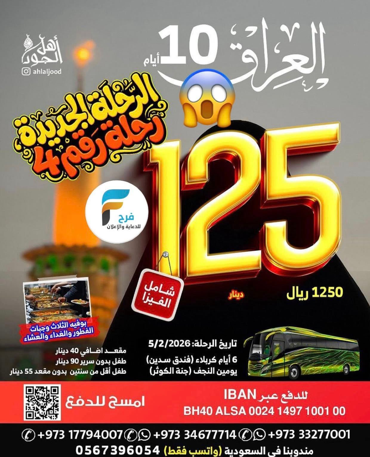 1250 ريال تبدأ رحلات اهل الجود الزيارة الشعبانية / العراق 25 يناير، 2026 1 للحجز و الاستفسار : مندوبنا في السعودية 0567396054 0097333277714 0097333277001 0097317794007 0097334677714 : الانستقرام https://www.instagram.com/ أشترك معنا في خدمة فرح :