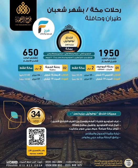 رحلات الطيران والحافلات حملة فوج الرحمة شهر شعبان / مكة المكرمة 26 يناير، 202625/12/06 3.♦ للحجز والاستفسار: ☎: 0138230034 📞: 0504838892 📞: 0595063009 📞: 0555848625 📞: 0503865077—————————————📍 موقع المكتب: القطيف – تاروت – بالقرب من سوق السمك https://goo.gl/maps/zsTTw4RH6Wk🔴 للاشتراك في قنوات التواصل ليصلكم الجديد 👇👇السناب شات : www.snapchat.comالإنستقرام : www.instagram.comالتلقرام : https://t.me/foujrahmaالفيس بوك : http://facebook.comكما يسعدنا اشتراككم معنا بقائمة الواتس آب عبر إرسال كلمة “ إشتراك “ للرقم التالي :0504838892 ☎فوج الرحمة للسياحة والسفر ➖فوج عطاء وانتماء➖أشترك معنا في خدمة فرح :