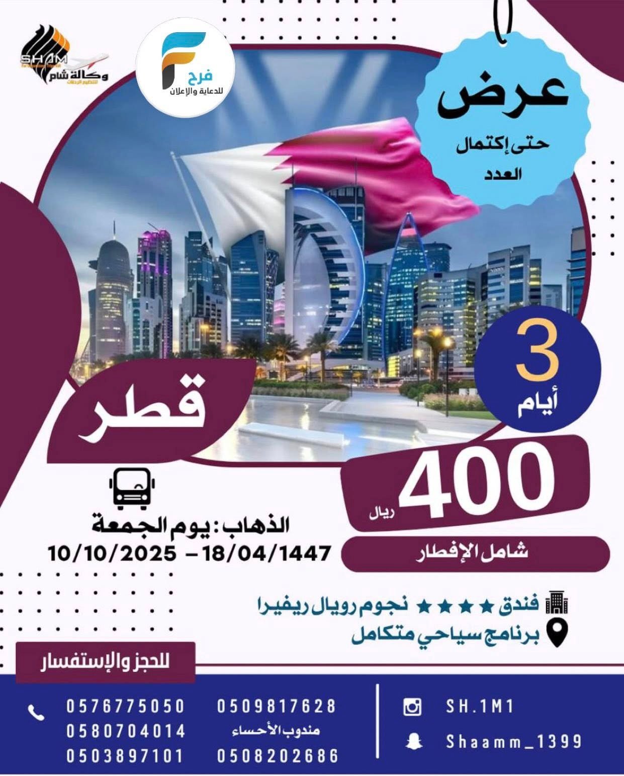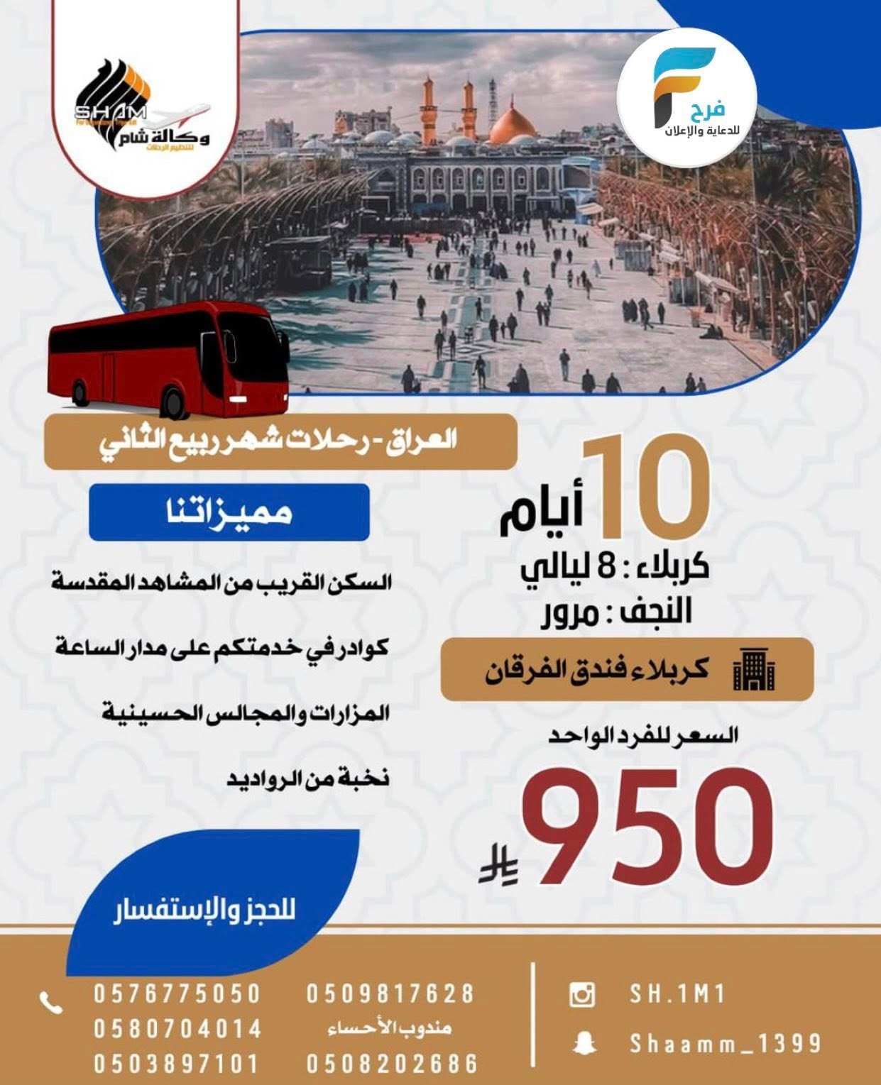 50 ريال تبدأ رحلات وكالة شام / الاحساء – البحرين – قطر – العراق 6 أكتوبر، 2025 725/08/16للحجز والاستفسار :من القطيف0576775050058070401405038971010509817628من الأحساء0508202686الانستقرام :https://www.instagram.com/سناب شات:www.snapchat.comأشترك معنا في خدمة فرح :