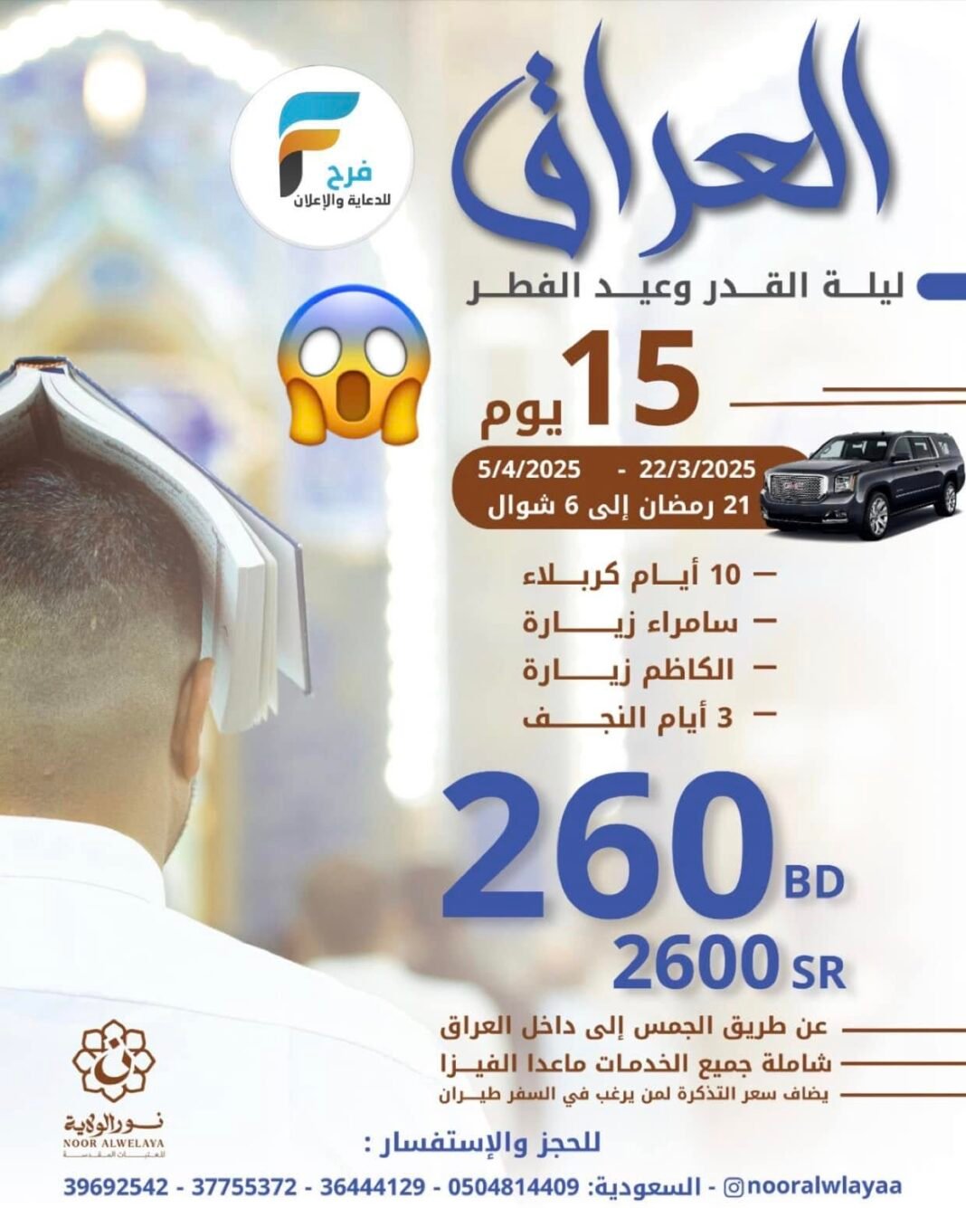 1300 ريال تبدأ رحلات GMC والحافلات نور الولاية ليلة القدر وعيد الفطر / العراق 2 مارس، 20251للحجز والإستفسار :0504814409009733969254200973377553720097336444129الانستقرام :-https://www.instagram.com أشترك معنا في خدمة فرح :