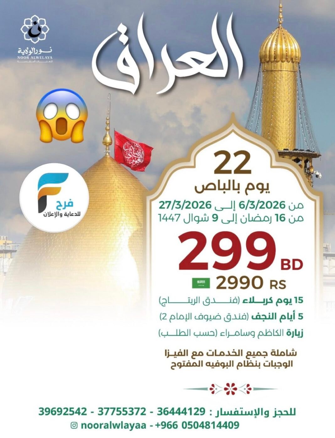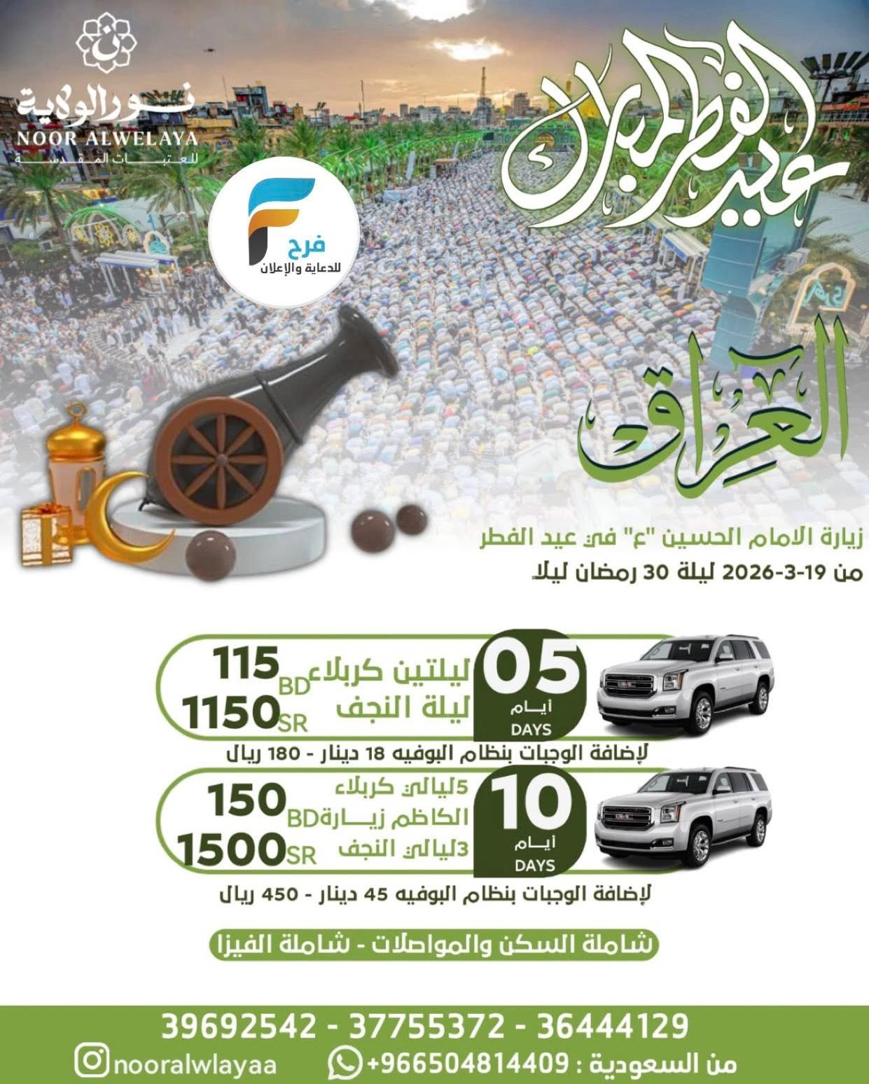 1150 ريال تبدأ رحلات GMC والحافلات نور الولاية / العراق 18 فبراير، 2026526/02/18للحجز والإستفسار :0504814409009733969254200973377553720097336444129الانستقرام :-https://www.instagram.com أشترك معنا في خدمة فرح :