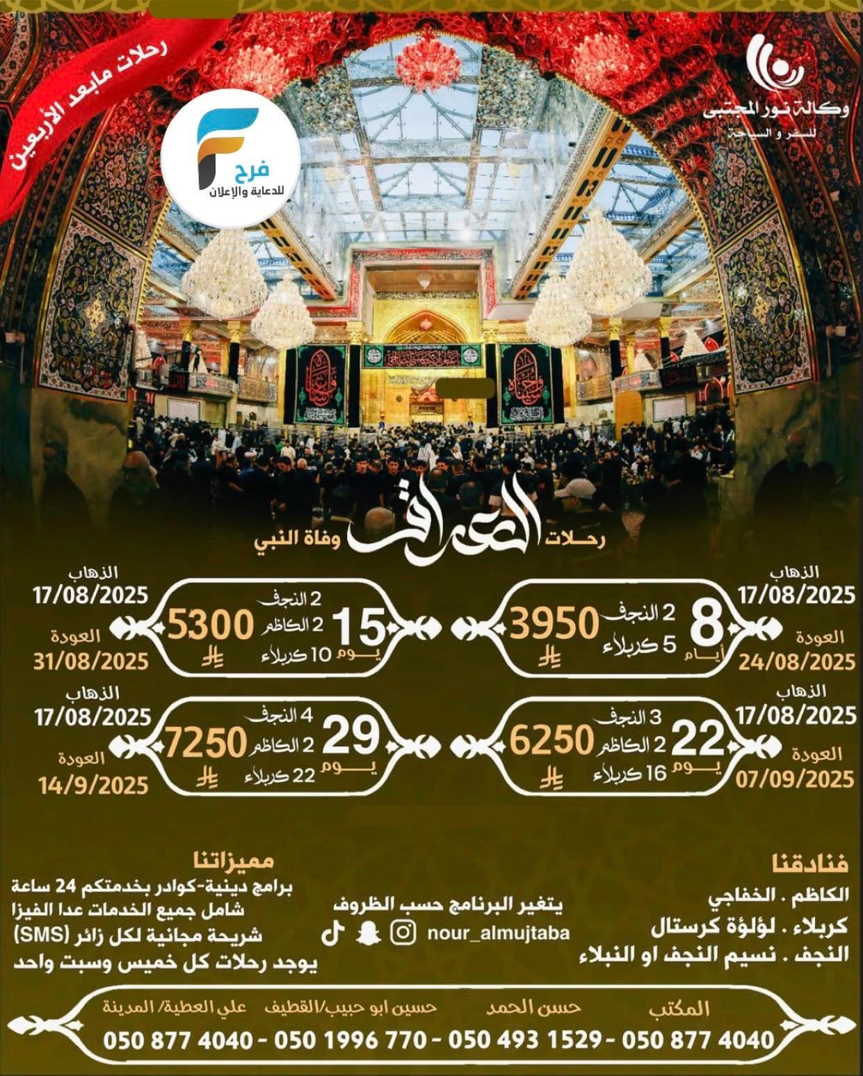 300 ريال فقط الفيزا العادية رحلات وكالة نور المجتبى وفاة النبي ص / العراق 11 أغسطس، 20251للحجز و الإستفسار :05087740400504931529054284966605019967700509774040حسابات السوشل ميدياNour_Almujtabaأشترك معنا في خدمة فرح :