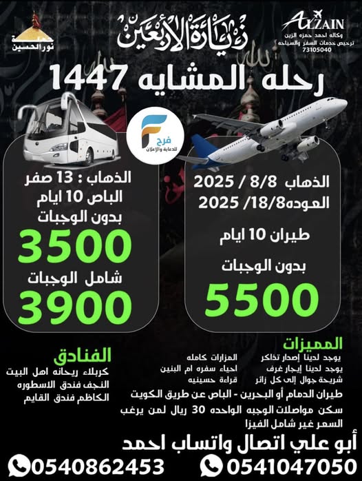 3500 ريال تبدأ رحلات حملة نور الحسين زيارة الأربعين / العراق 24 يوليو، 2025 1 للحجز أو الاستفسار:- 0541047050 0540862453 أشترك معنا في خدمة فرح : Enter the text or HTML code here شارك هذا الموضوع: النقر للمشاركة على X (فتح في نافذة جديدة) X انقر للمشاركة على فيسبوك (فتح في نافذة جديدة) فيس بوك معجب بهذه:إعجاب تحميل... مرتبط