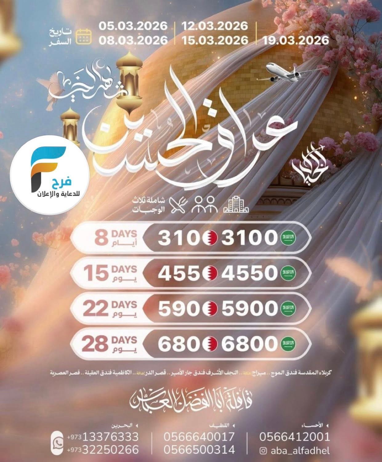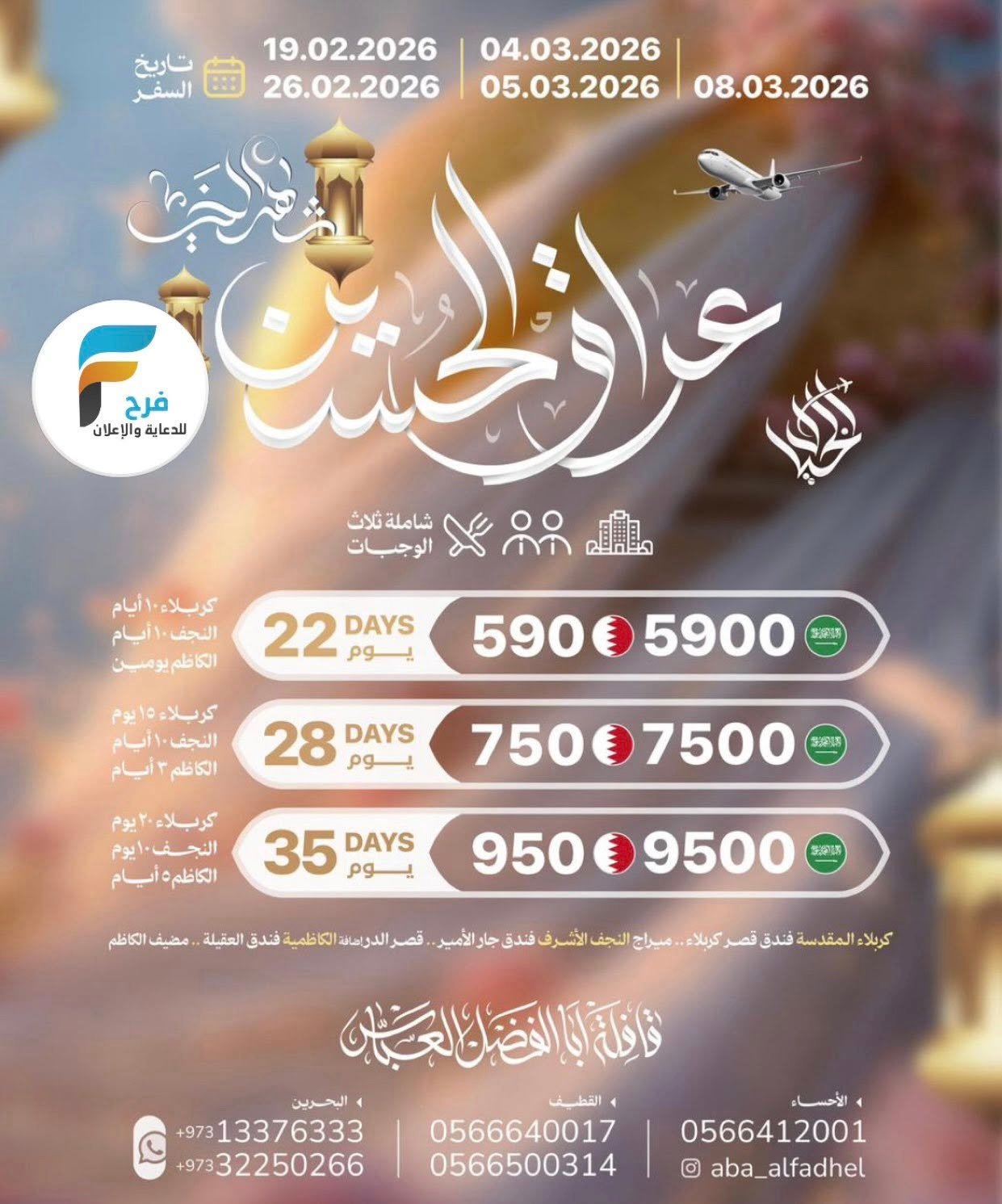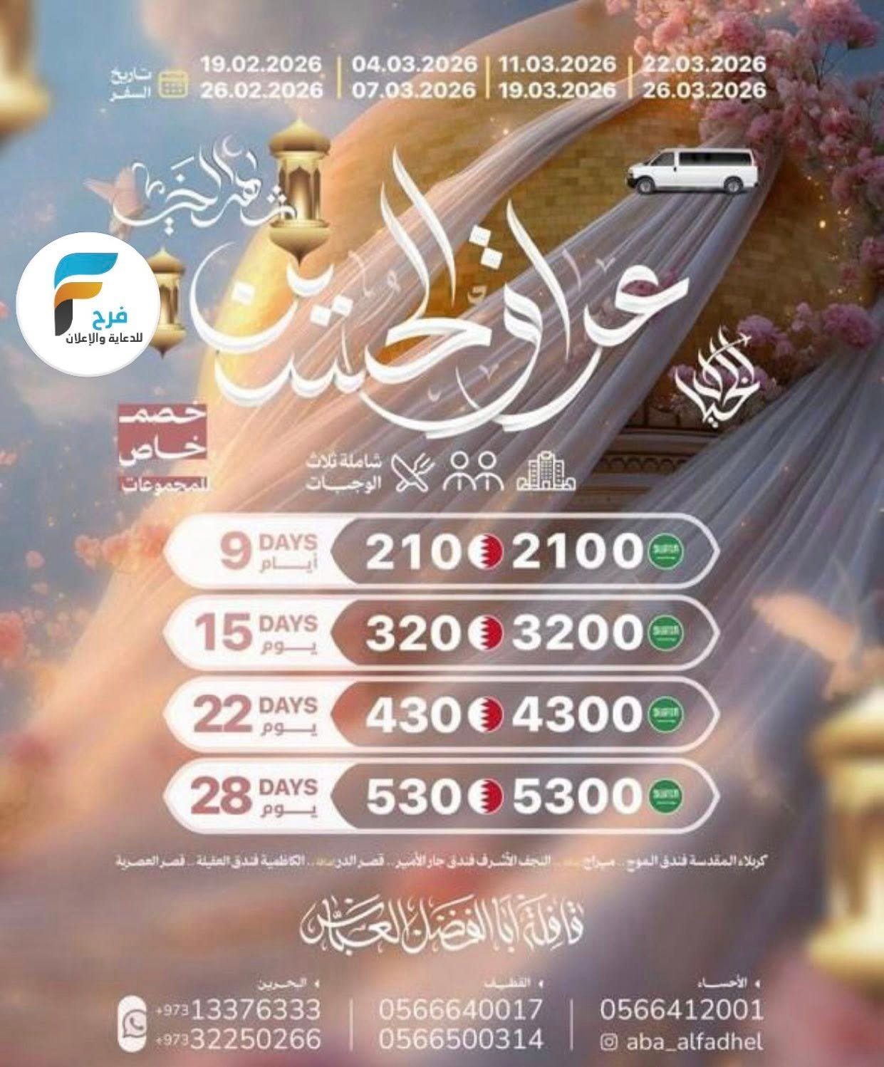 2100 ريال تبدأ رحلات الحافلات والطيران قافلة ابا الفضل العباس شهر رمضان / العراق 17 فبراير، 2026325/12/09للحجز أو الاستفسار :القطيف:05583352970566500314056664001705446964770566285623الاحساء:05664120010501908993البحرين:00973133763330097332250266انستغرام :Aba_alfadhelفيس بوك / قافلة ابا الفضل العباس سناب /https://www.snapchat.comأشترك معنا في خدمة فرح :