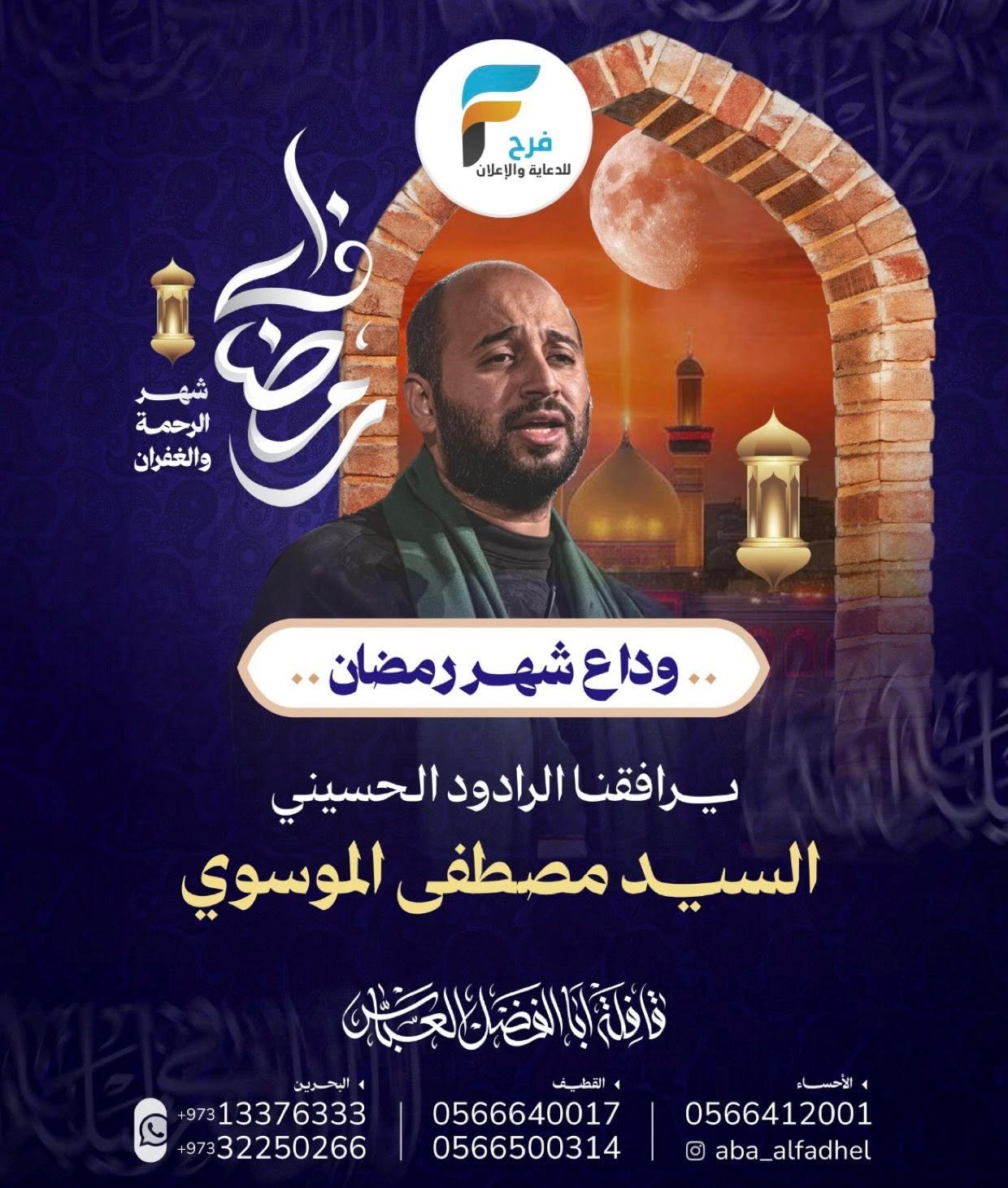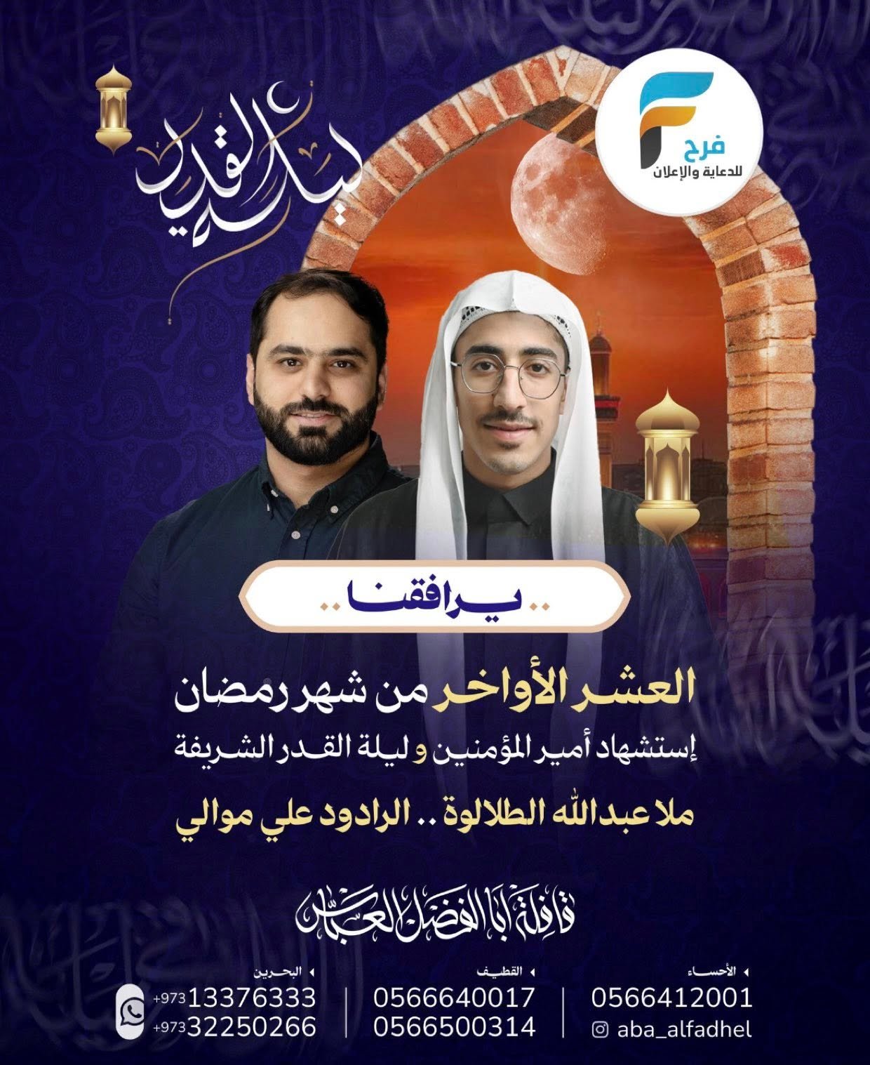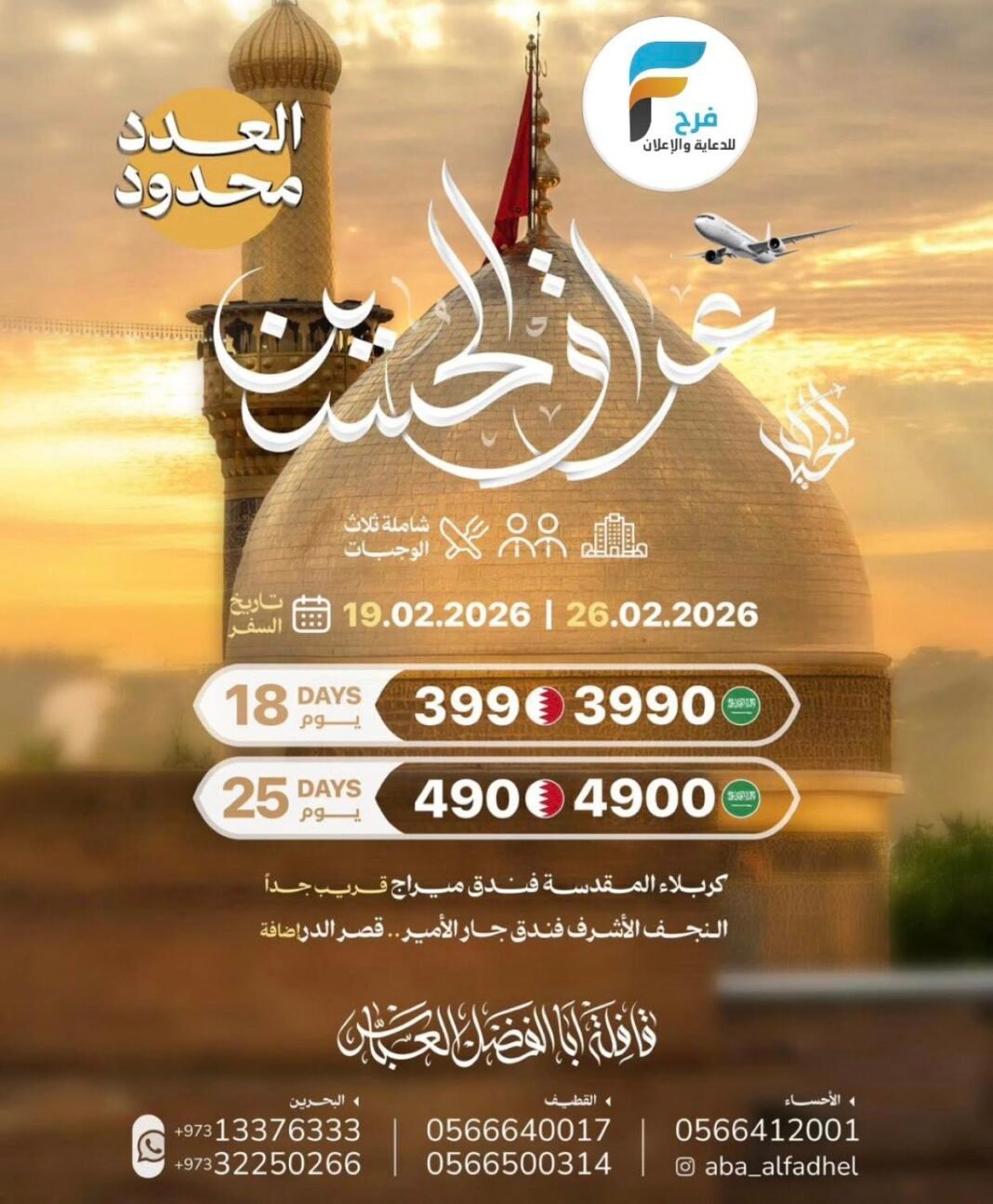 2100 ريال تبدأ رحلات الحافلات والطيران قافلة ابا الفضل العباس شهر رمضان / العراق 17 فبراير، 2026325/12/09للحجز أو الاستفسار :القطيف:05583352970566500314056664001705446964770566285623الاحساء:05664120010501908993البحرين:00973133763330097332250266انستغرام :Aba_alfadhelفيس بوك / قافلة ابا الفضل العباس سناب /https://www.snapchat.comأشترك معنا في خدمة فرح :