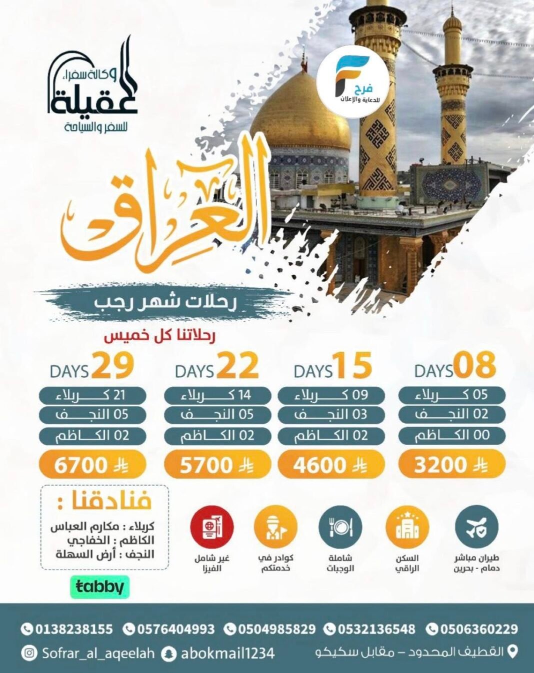 3200 ريال تبدأ رحلات وكالة سفراء العقيلة طيران رجب وإجازة منتصف العام / العراق 18 ديسمبر، 20254 25/12/06📱 للإستفسار والحجزالمكتب :0138238155057640499305049858290532136548ابو كميل: 0504985829ام كميل:0506360229♦ الانستقرام sofara_al_aqeelahأشترك معنا في خدمة فرح :