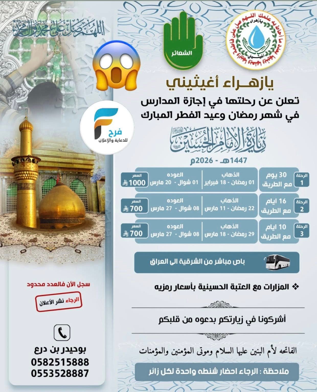 600 ريال تبدأ رحلات قافلة يازهراء اغيثيني الزيارة الشعبانية وشهر رمضان / العراق 24 يناير، 2026لم 125/08/24قافلة يازهراء أغيثينيللحجز و الاستفسار :بو حيدر بن درع:05825158880553528887أشترك معنا في خدمة فرح :