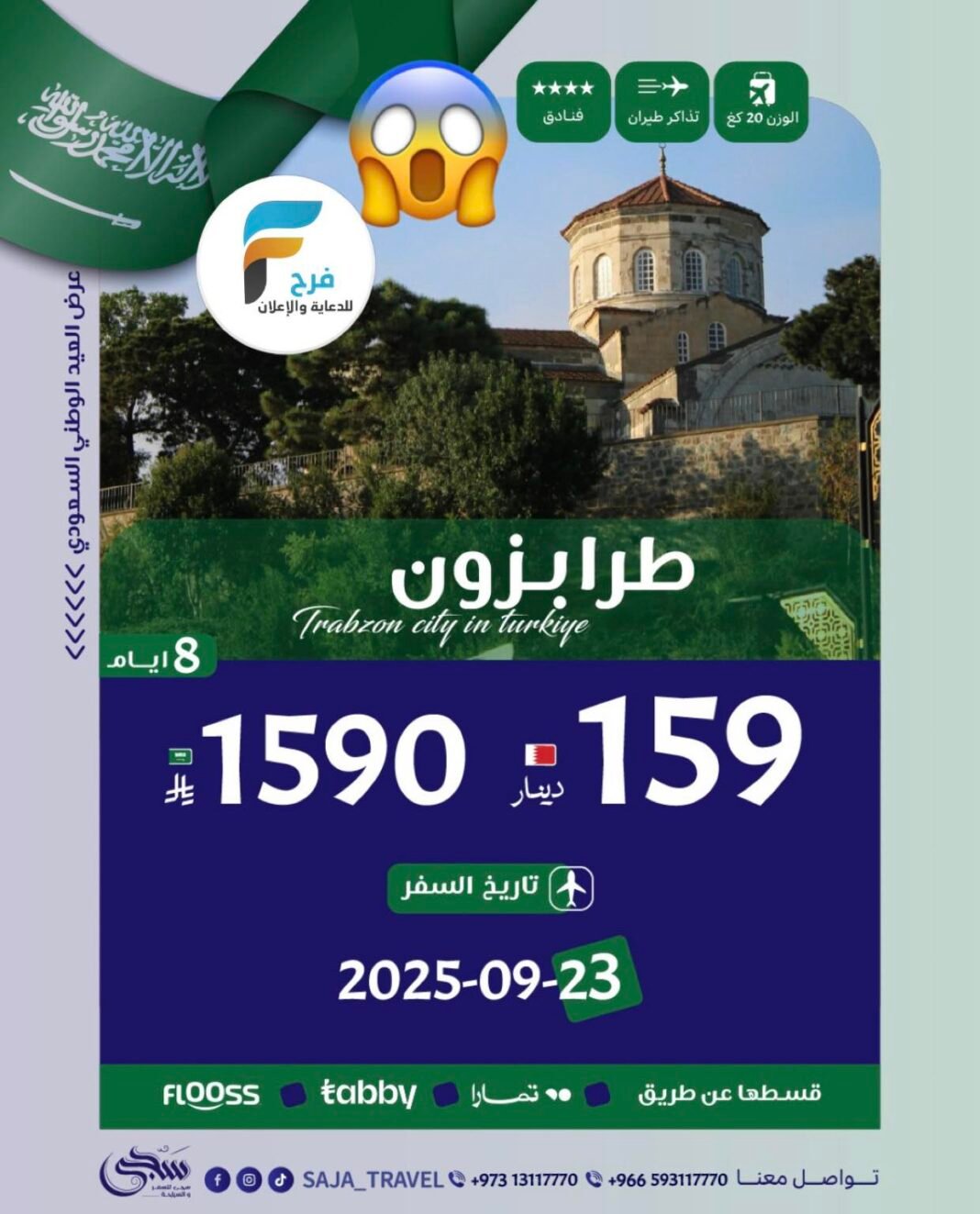 1590ريال فقط عرض اليوم الوطني رحلة سجى للسفر والسياحة / تركيا 18 سبتمبر، 202561للحجز والإستفسار :السعودية :- 0593117770البحرين :- 00973131177700097332111565♦ الانستقرام :- saja_travelأشترك معنا في خدمة فرح :