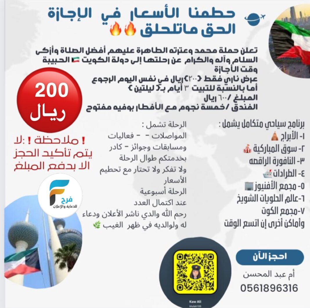 200 ريال تبدأ حملة النبي محمد وعترته ص / الكويت 8 يناير، 2024 1 للحجز و الاستفسار : 0561896316 أشترك معنا في خدمة فرح : Enter the text or HTML code here شارك هذا الموضوع: النقر للمشاركة على X (فتح في نافذة جديدة) X انقر للمشاركة على فيسبوك (فتح في نافذة جديدة) فيس بوك معجب بهذه:إعجاب تحميل... مرتبط