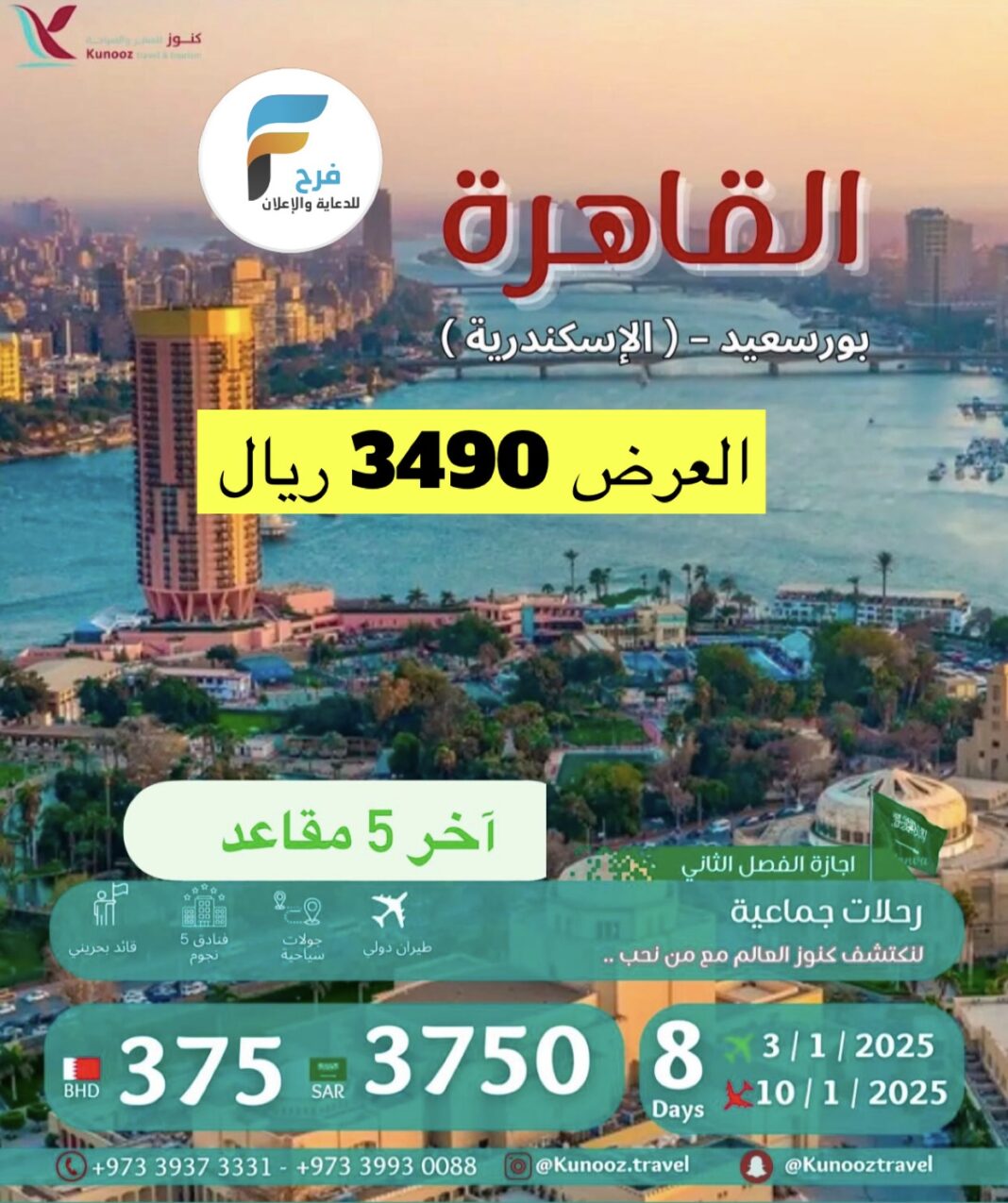 2390 ريال تبدأ رحلات كنوز للسفر والسياحة إجازة الفصل الثاني / مصر – كزاخستان – روسيا – تركيا 29 ديسمبر، 2024 2 للحجز و الاستفسار : 0097339930088 0097339662044 0599992153 : الانستقرام https://www.instagram.com/ أشترك معنا في خدمة فرح : Enter the text or HTML code here شارك هذا الموضوع: النقر للمشاركة على X (فتح في نافذة جديدة) X انقر للمشاركة على فيسبوك (فتح في نافذة جديدة) فيس بوك معجب بهذه:إعجاب تحميل... مرتبط