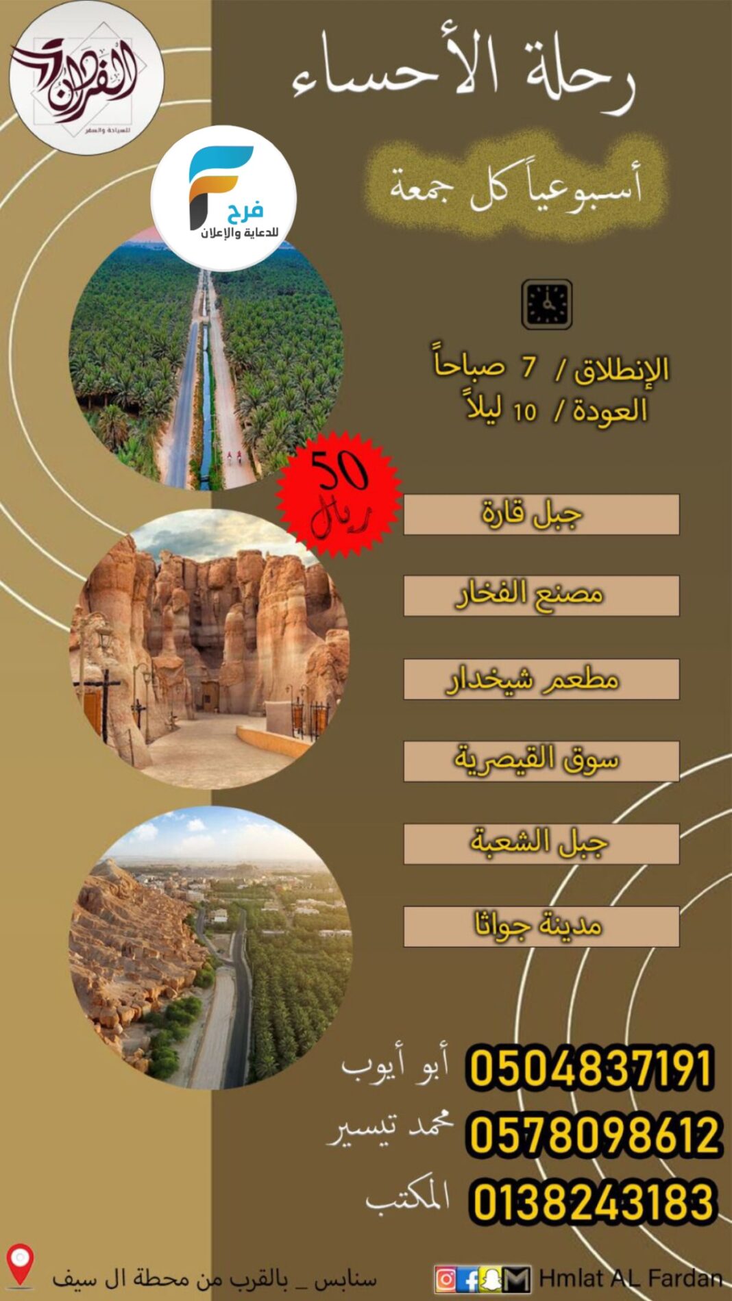 50 ريال رحلة حملة الفردان / الاحساء 12 مايو، 2024 8 للاتصال و الاستفسار : 0504837191 0578098612 0138243183 📍العنوان : سنابس بقرب من محطة ال سيف للمحروقات أشترك معنا في خدمة فرح : Enter the text or HTML code here شارك هذا الموضوع: النقر للمشاركة على X (فتح في نافذة جديدة) X انقر للمشاركة على فيسبوك (فتح في نافذة جديدة) فيس بوك معجب بهذه:إعجاب تحميل... مرتبط