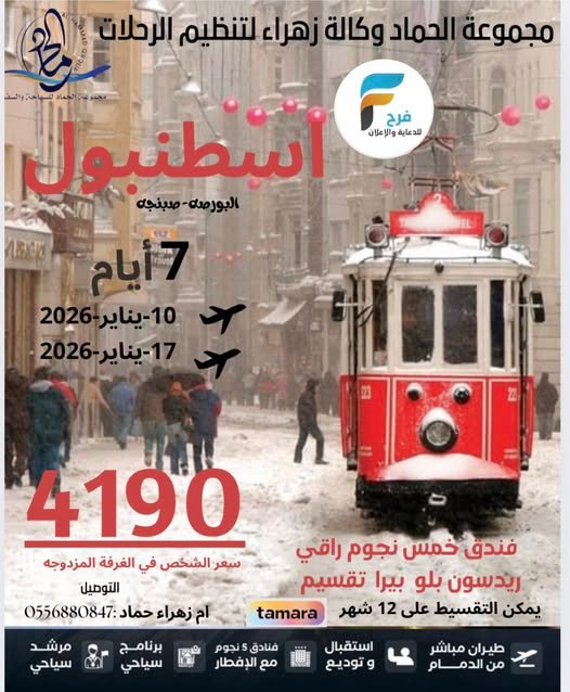 رحلة مجموعة الحماد للسفر والسياحة / تركيا 17 ديسمبر، 20256 25/09/09للاستفسار والحجز واتساب :0556880847أو الإتصال على الأرقام التالية:محمد أبو زهراء:0509486700أو0564000015أم زهراء:05568808470547188291للمتابعة على برامج التواصل سناب شات: Hammadgroupsانستقرام: Hammadgroups 💐 لطفا التكرم بنشر اﻹعلان ..أشترك معنا في خدمة فرح :