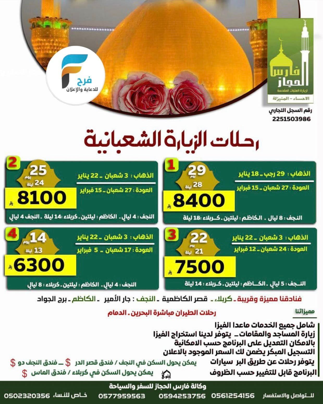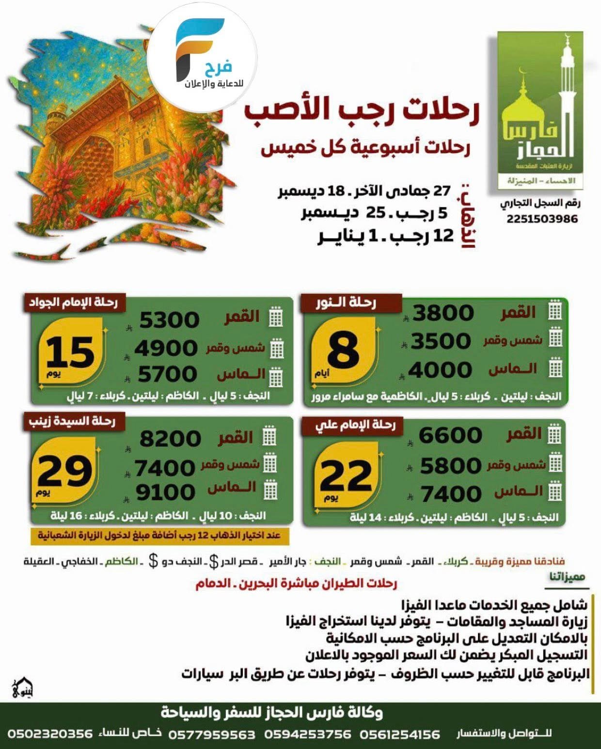3500 ريال تبدأ رحلات وكالة فارس الحجاز إجازة منتصف العام / العراق 23 ديسمبر، 2025 لم 1 للحجز أو الاستفسار : 0561254156 0577959563 0594253756 للنساء فقط0502320356 الانستقرامhttps://www.instagram.com/ أشترك معنا في خدمة فرح :