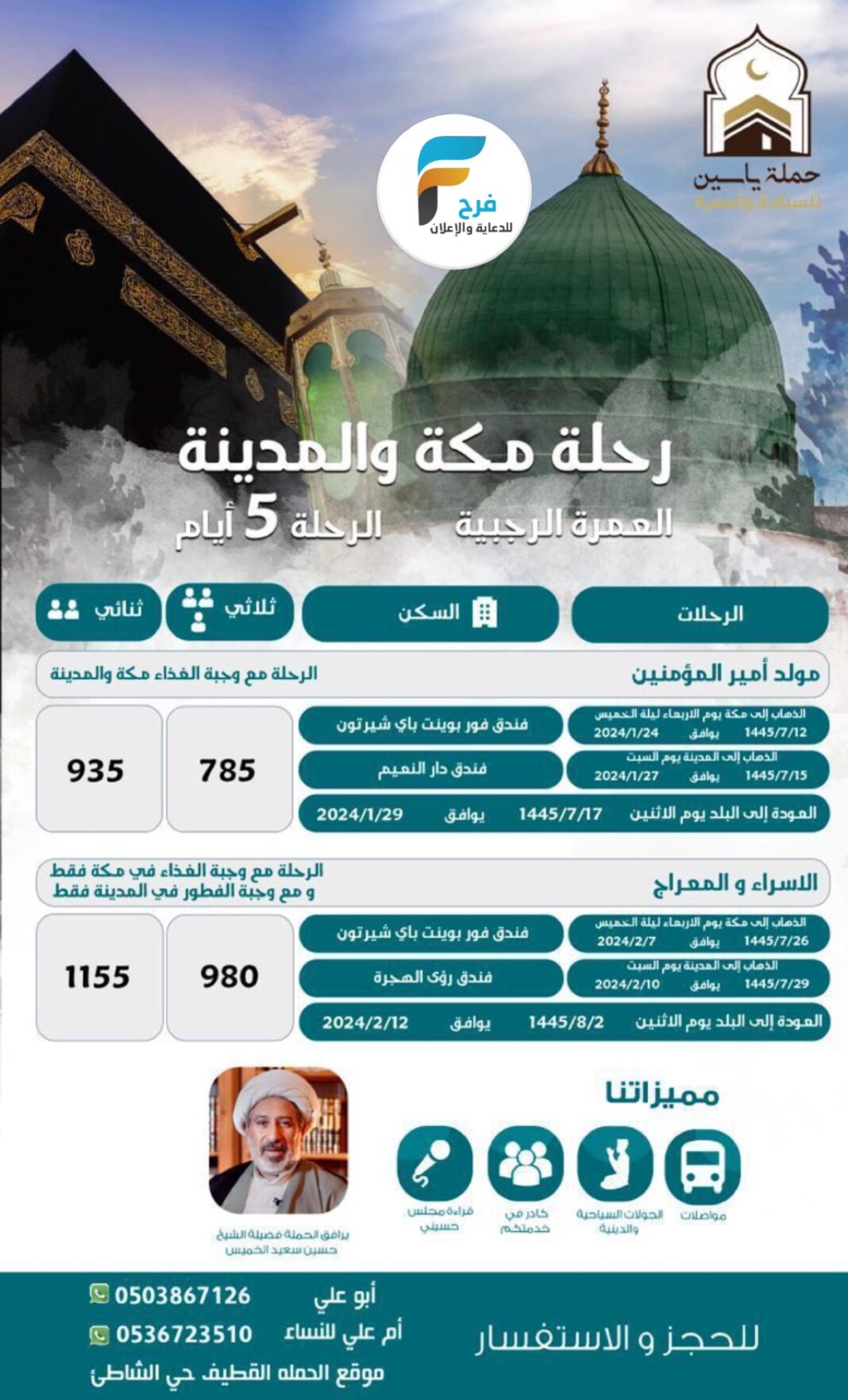 785 ريال 5 أيام رحلات حملة ياسين / العمرة الرجبية والمدينة المنورة 9 يناير، 2024 2 للحجز والإستفسار :- 0503867126 0536723510 أشترك معنا في خدمة فرح : Enter the text or HTML code here شارك هذا الموضوع: النقر للمشاركة على X (فتح في نافذة جديدة) X انقر للمشاركة على فيسبوك (فتح في نافذة جديدة) فيس بوك معجب بهذه:إعجاب تحميل... مرتبط