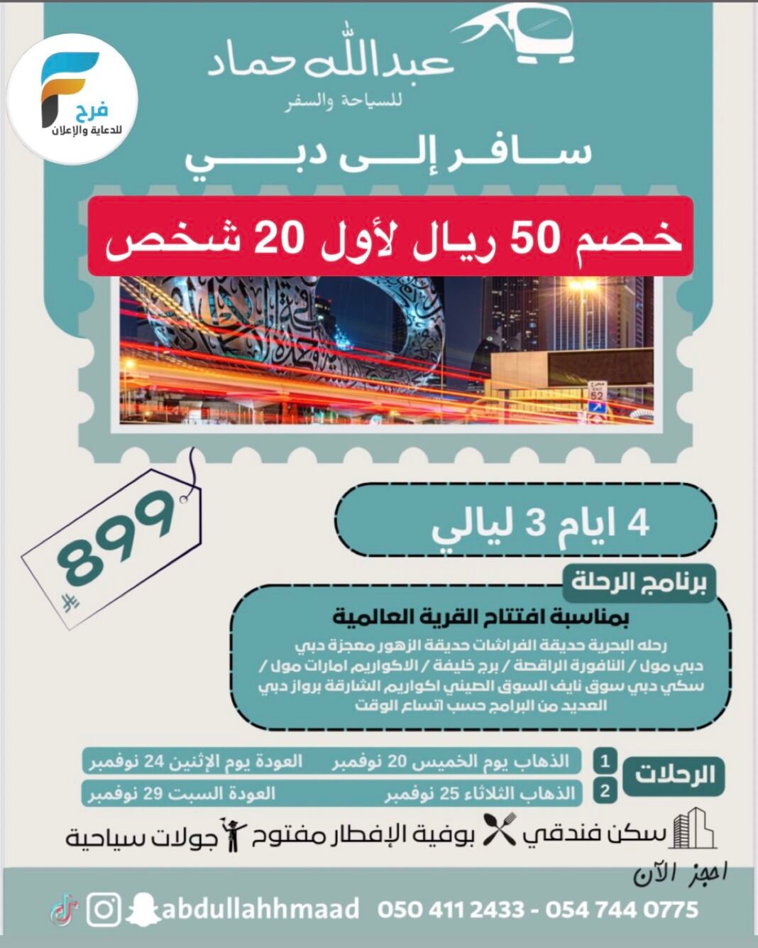 50 ريال خصم رحلة قافلة عبدالله حماد / دبي _ الرياض 8 نوفمبر، 2025 للحجز و الاستفسار : عبدالله حماد: 0504112433 للنساء: 0547440775 تاروت سيد حسين : 0501919816 : سناب شات https://www.snapchat.com : الانستقرام https://www.instagram.com/ أشترك معنا في خدمة فرح : شارك هذا الموضوع: النقر للمشاركة على X (فتح في نافذة جديدة) X انقر للمشاركة على فيسبوك (فتح في نافذة جديدة) فيس بوك معجب بهذه:إعجاب تحميل... مرتبط