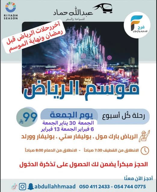 99 ريال فقط آخر رحلات قافلة عبدالله حماد / الرياض 24 يناير، 2026للحجز و الاستفسار :عبدالله حماد: 0504112433للنساء: 0547440775تاروت سيد حسين : 0501919816: سناب شاتhttps://www.snapchat.com : الانستقرامhttps://www.instagram.comأشترك معنا في خدمة فرح :