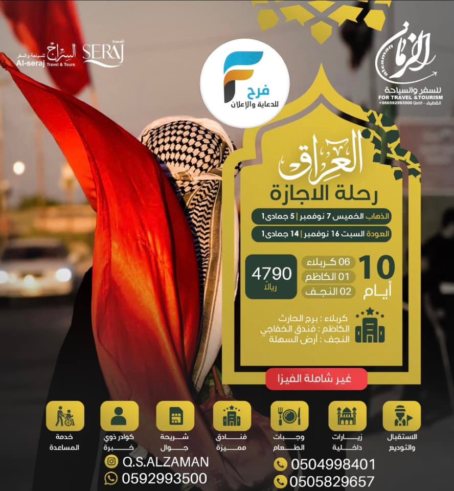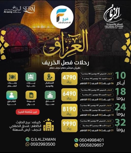 4790 ريال تبدأ رحلات قافلة صاحب الزمان ع / العراق 24 سبتمبر، 20245للحجز والاستفسار0504998401050582965705929935000138532005انستقرامwww.instagram.comأشترك معنا في خدمة فرح :