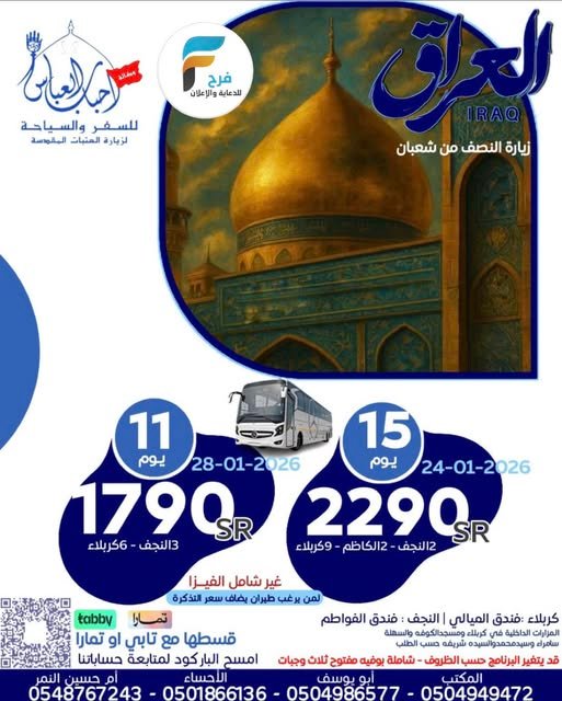 الرئيسية العراق 1790 ريال تبدأ رحلات الحافلات والطيران وكالة احباب العباس الزيارة الشعبانية /...