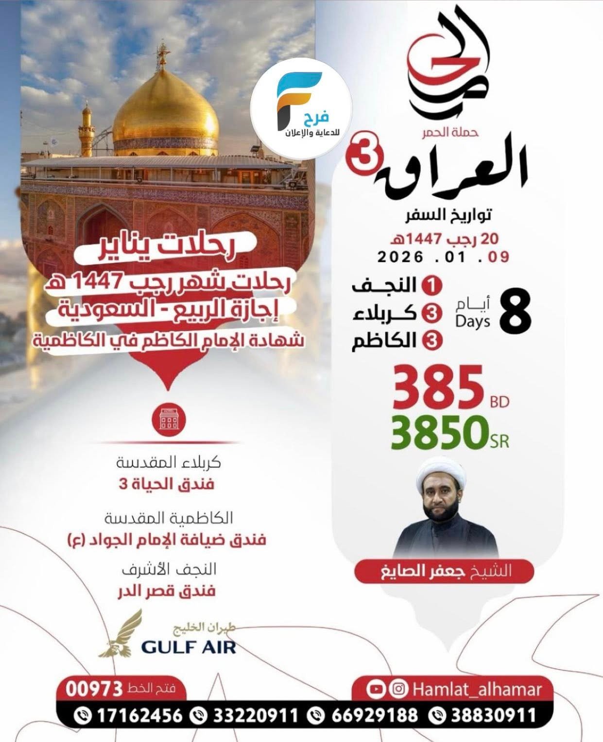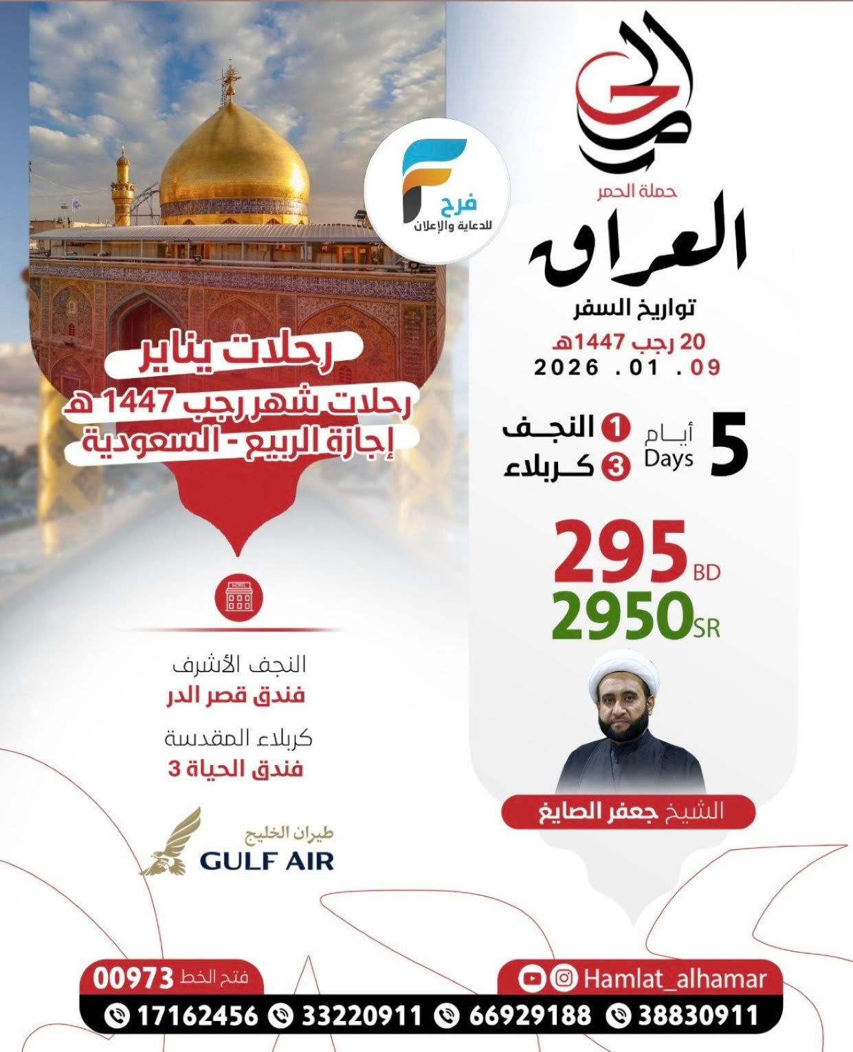 2950 ريال تبدأ رحلات الطيران حملة الحمر شهر رجب وإجازة المنتصف / العراق 5 يناير، 20264للحجز والاستفسار :-0097366929188009733322091100973388309110097317162456انستقرام:www.instagram.comأشترك معنا في خدمة فرح :