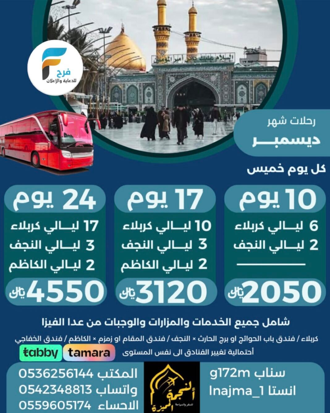 2050 ريال تبدأ رحلات الحافلات والطيران وكالة النجمة المميزة / العراق 19 نوفمبر، 2025125/08/31للحجز والاستفسار :053625614405423488130559605174الإنستقرام :www.instagram.comسناب شات :www.snapchat.comأشترك معنا في خدمة فرح :