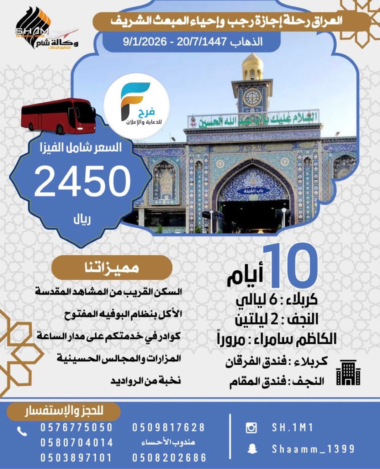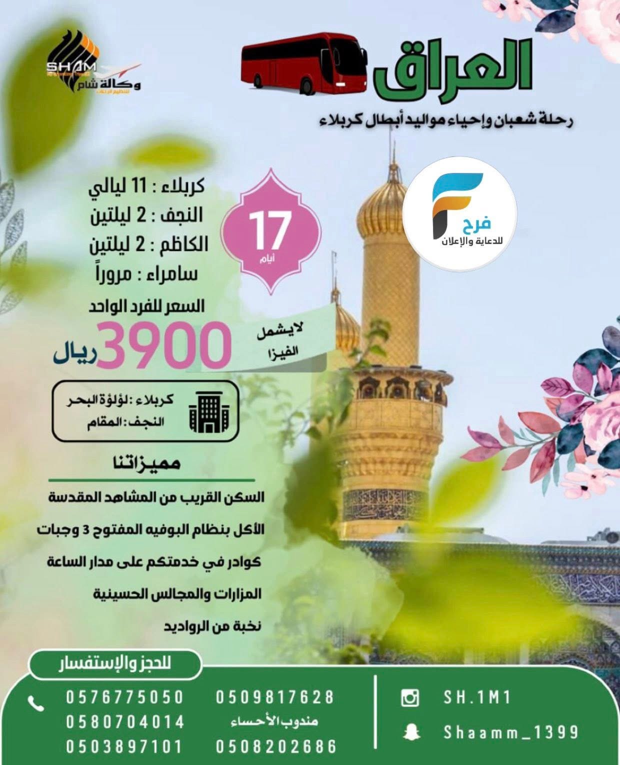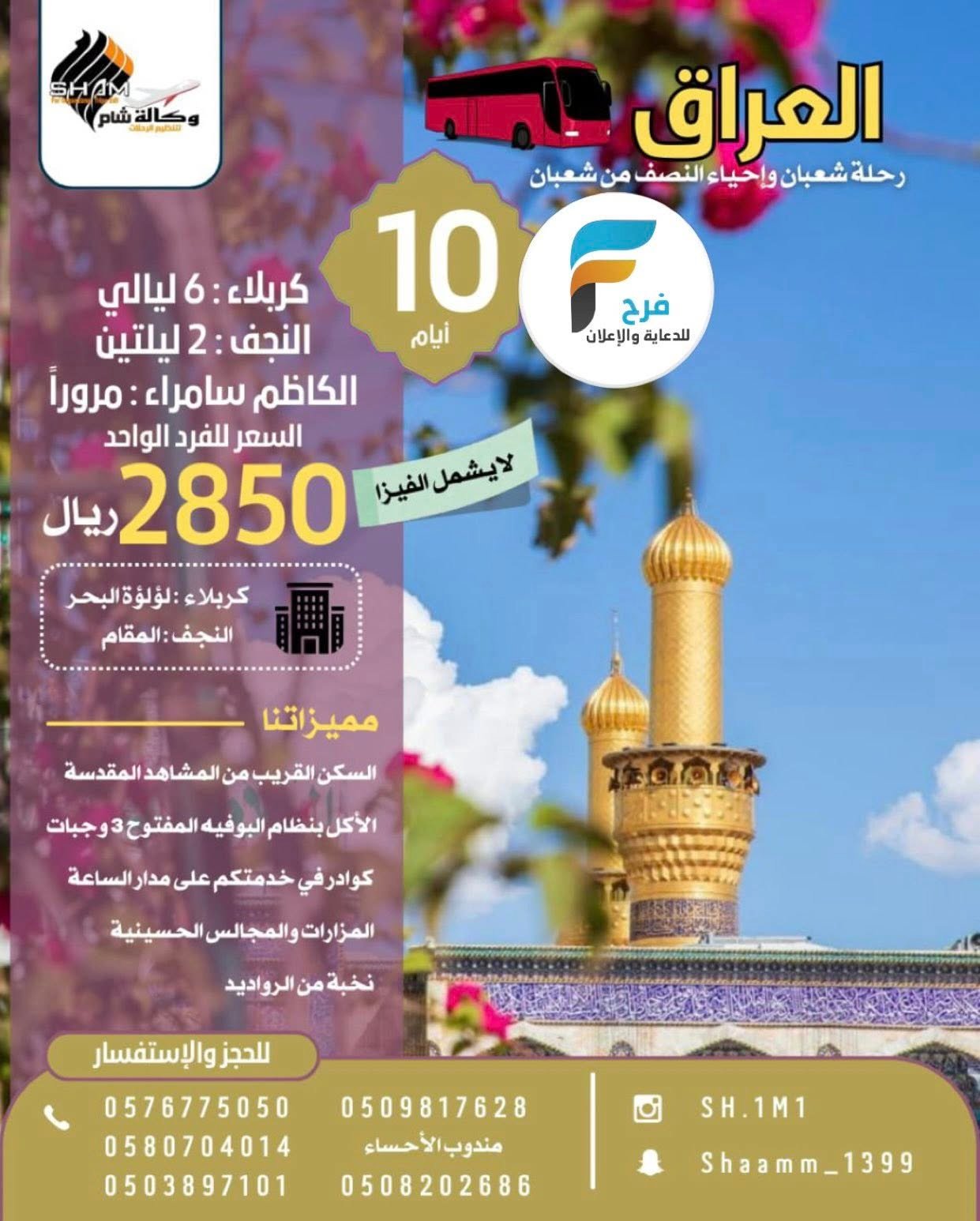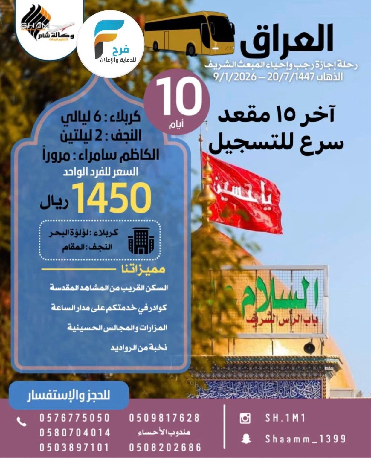 1450 ريال تبدأ رحلات الحافلات وكالة شام / العراق 30 ديسمبر، 2025125/08/16للحجز والاستفسار :من القطيف0576775050058070401405038971010509817628من الأحساء0508202686الانستقرام :https://www.instagram.com/سناب شات:www.snapchat.comأشترك معنا في خدمة فرح :