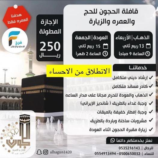 250 ريال فقط رحلات قافلة الحجون الإجازة المطولة / مكة المكرمة 3 أكتوبر، 20241للحجز والاستفسار : للرجال 0535216143للنساء 0500650032 0554913494 أشترك معنا في خدمة فرح :