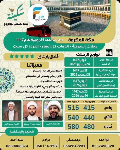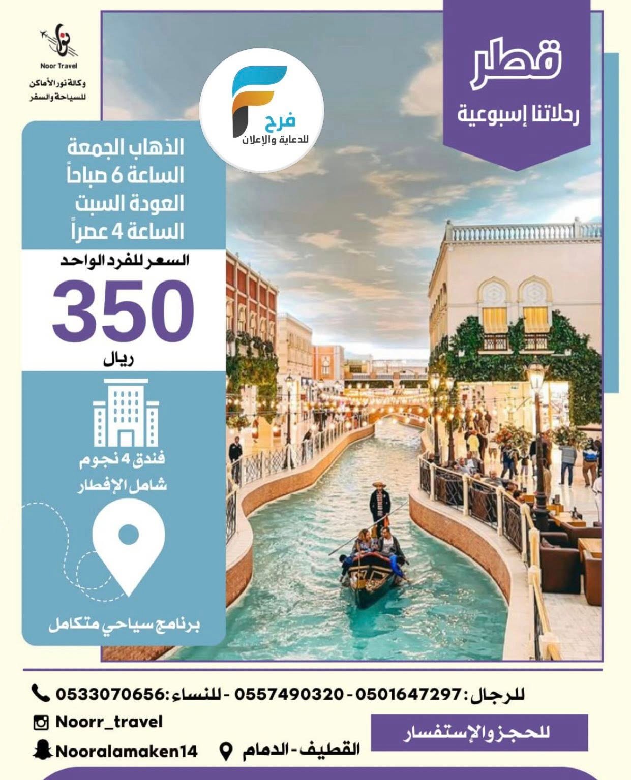350 ريال تبدأ رحلات وكالة نور الاماكن / العمرة الرجبية – قطر 22 ديسمبر، 2025725/09/27للحجز و الاستفسار :05016472970557490320النساء :0533070656انستقرام :www.instagram.comأشترك معنا في خدمة فرح :
