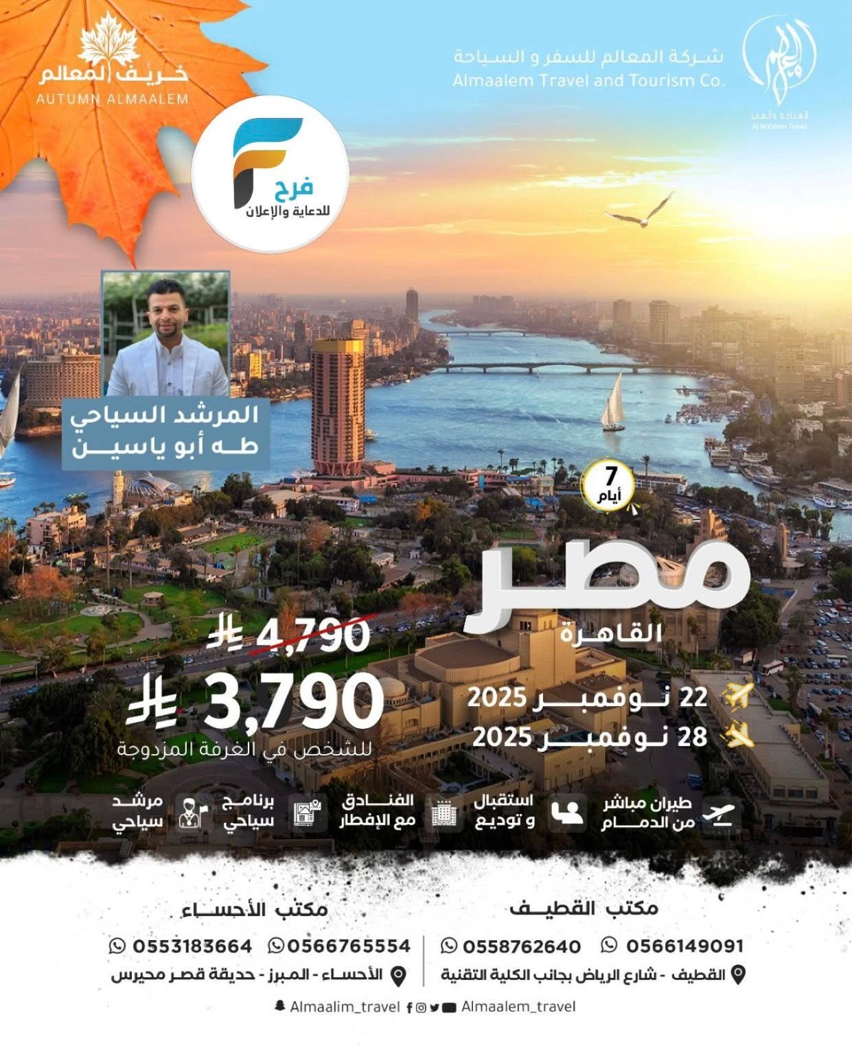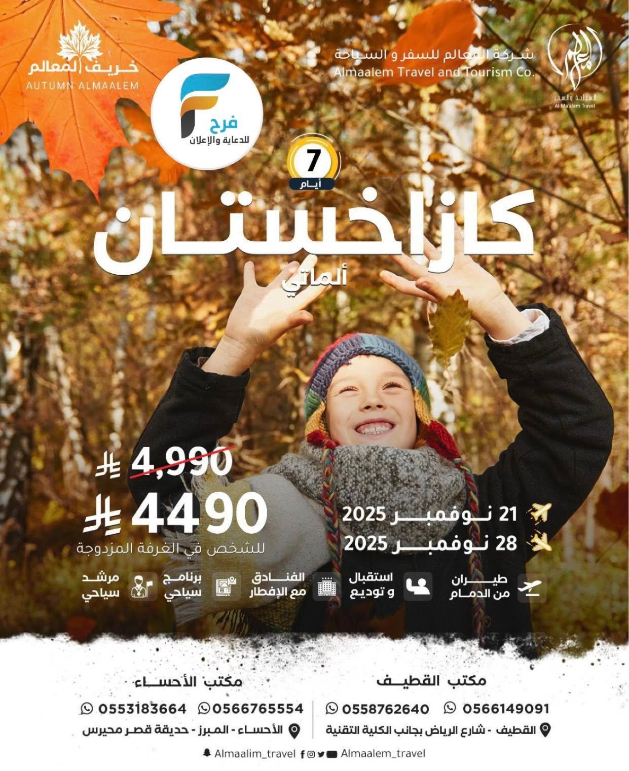 خصومات وعروض رحلات شركة المعالم للسفر والسياحة / اذربيجان – جورجيا – كازاخستان – مصر 13 نوفمبر، 2025لم 1للحجز أو الاستفسار :مكتب القطيف:056614909105661481510558762640050386514305038061330554380342056463876605942670420538263916مكتب الاحساء:05531836640566765554الانستقرام : https://www.instagram.com/أشترك معنا في خدمة فرح :