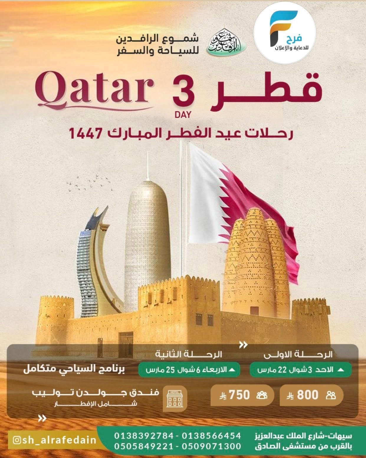 750 ريال تبدأ رحلات مكتب شموع الرافدين عيد الفطر / المدينة المنورة – قطر 26 فبراير، 20264للحجز و الاستفسار :رضا آل منيان0509071300علي آل منيان0505849221المكتب01383927840138566454الانستقرام:www.instagram.comأشترك معنا في خدمة فرح :