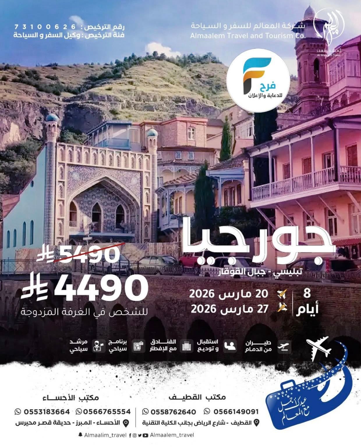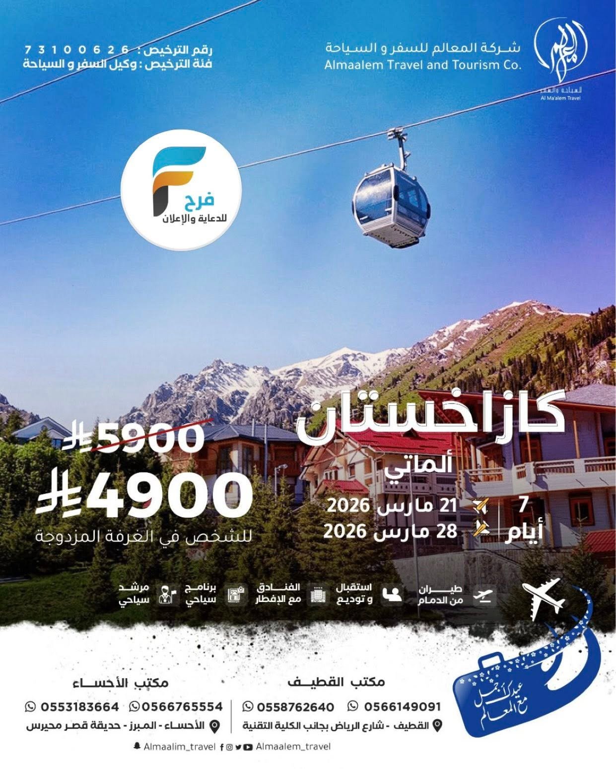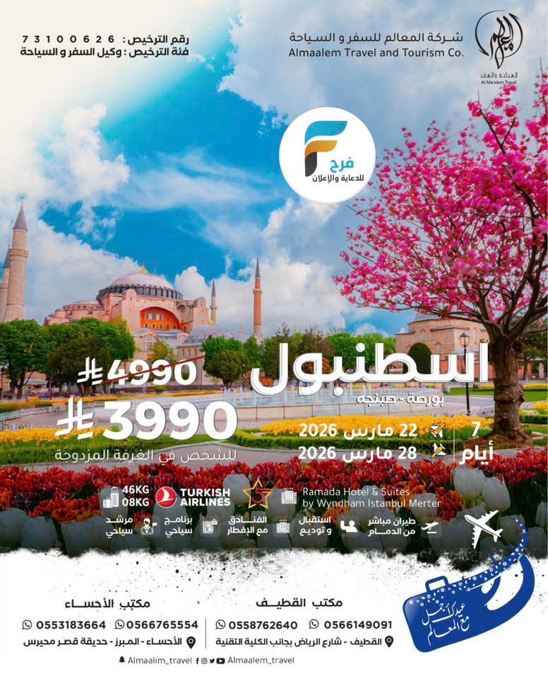 خصومات وعروض رحلات شركة المعالم للسفر والسياحة عيد الفطر / تركيا – اذربيجان – جورجيا – كازاخستان 30 يناير، 2026لم 4للحجز أو الاستفسار :مكتب القطيف:056614909105661481510558762640050386514305038061330554380342056463876605942670420538263916مكتب الاحساء:05531836640566765554الانستقرام : https://www.instagram.com/أشترك معنا في خدمة فرح :
