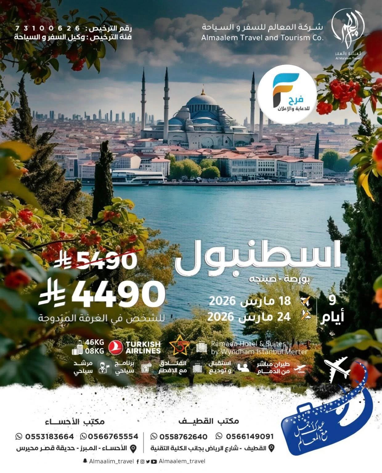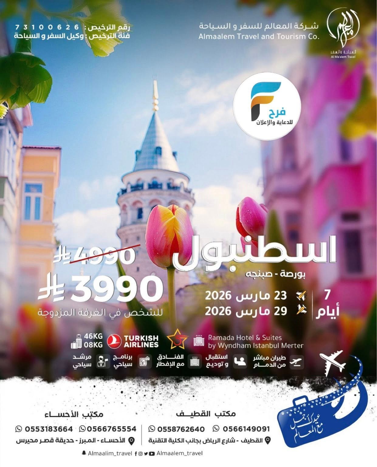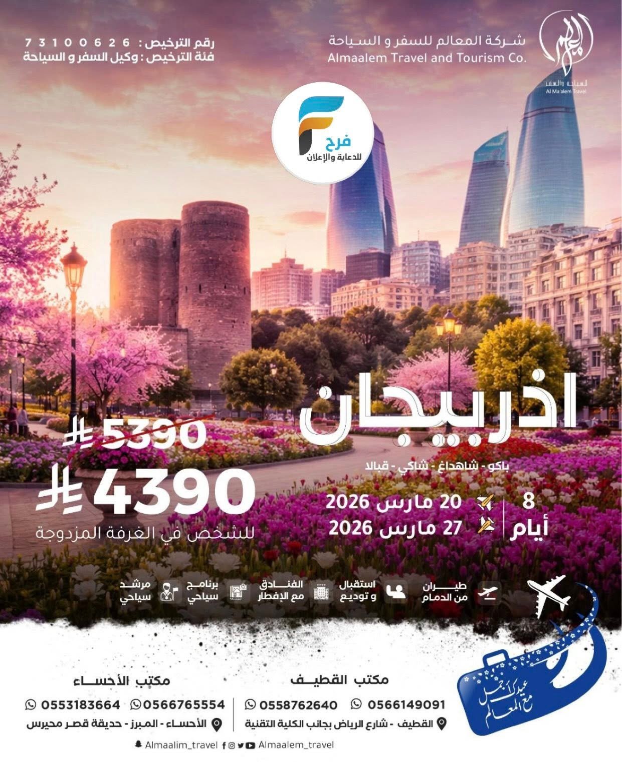 خصومات وعروض رحلات شركة المعالم للسفر والسياحة عيد الفطر / تركيا – اذربيجان – جورجيا – كازاخستان 30 يناير، 2026لم 4للحجز أو الاستفسار :مكتب القطيف:056614909105661481510558762640050386514305038061330554380342056463876605942670420538263916مكتب الاحساء:05531836640566765554الانستقرام : https://www.instagram.com/أشترك معنا في خدمة فرح :