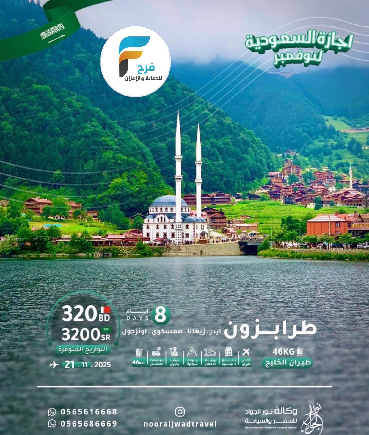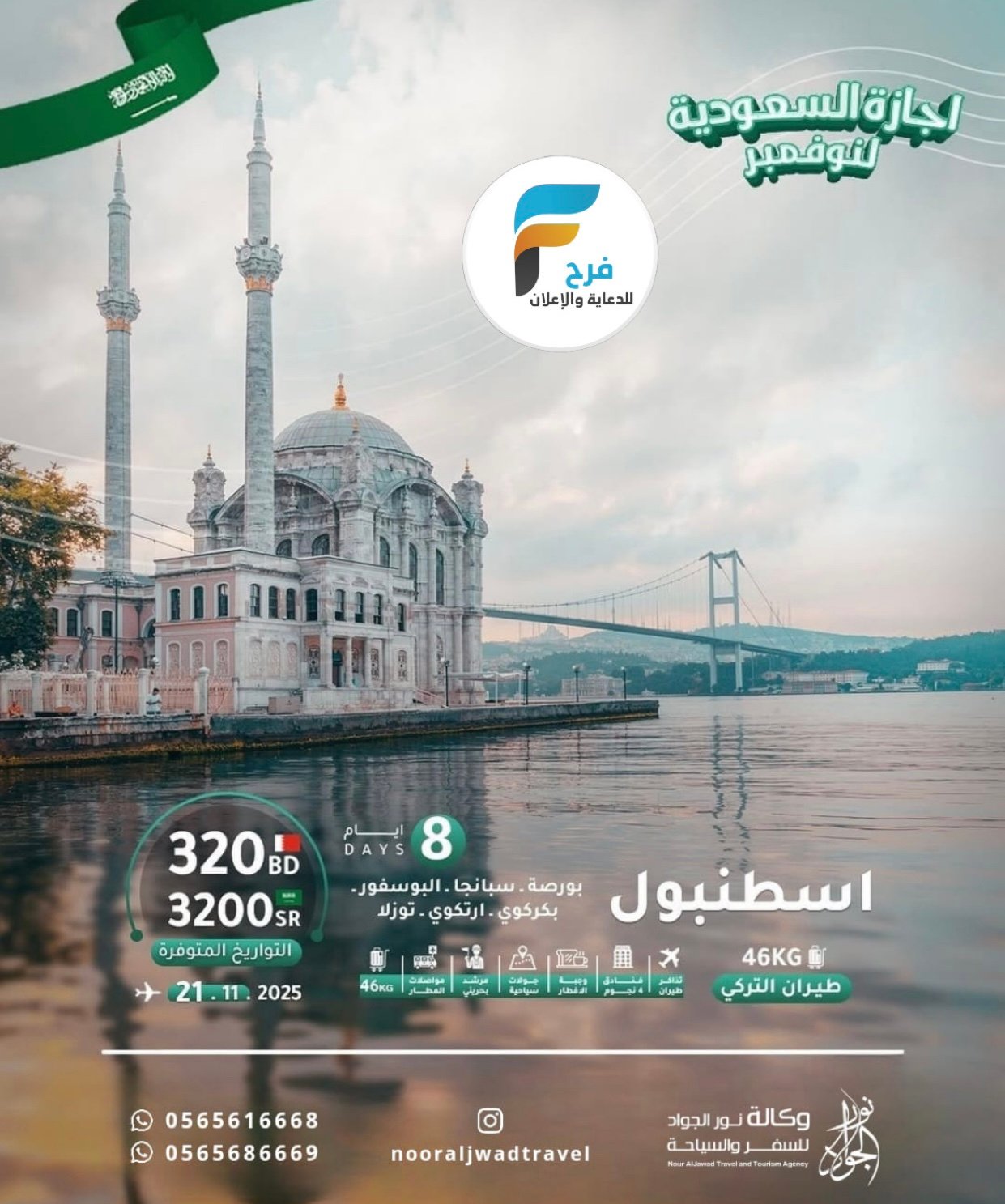3200 تبدأ رحلات وكالة نور الجواد إجازة الخريف / العراق _ تركيا _ اذربيجان 8 نوفمبر، 20251للحجز و الاستفسار :-القطيف:056561666805656866690500757574054377799905058884600543717104الأحساء:05069294190595008821الانستقرامwww.instagram.comالسنابwww.snapchat.comأشترك معنا في خدمة فرح :