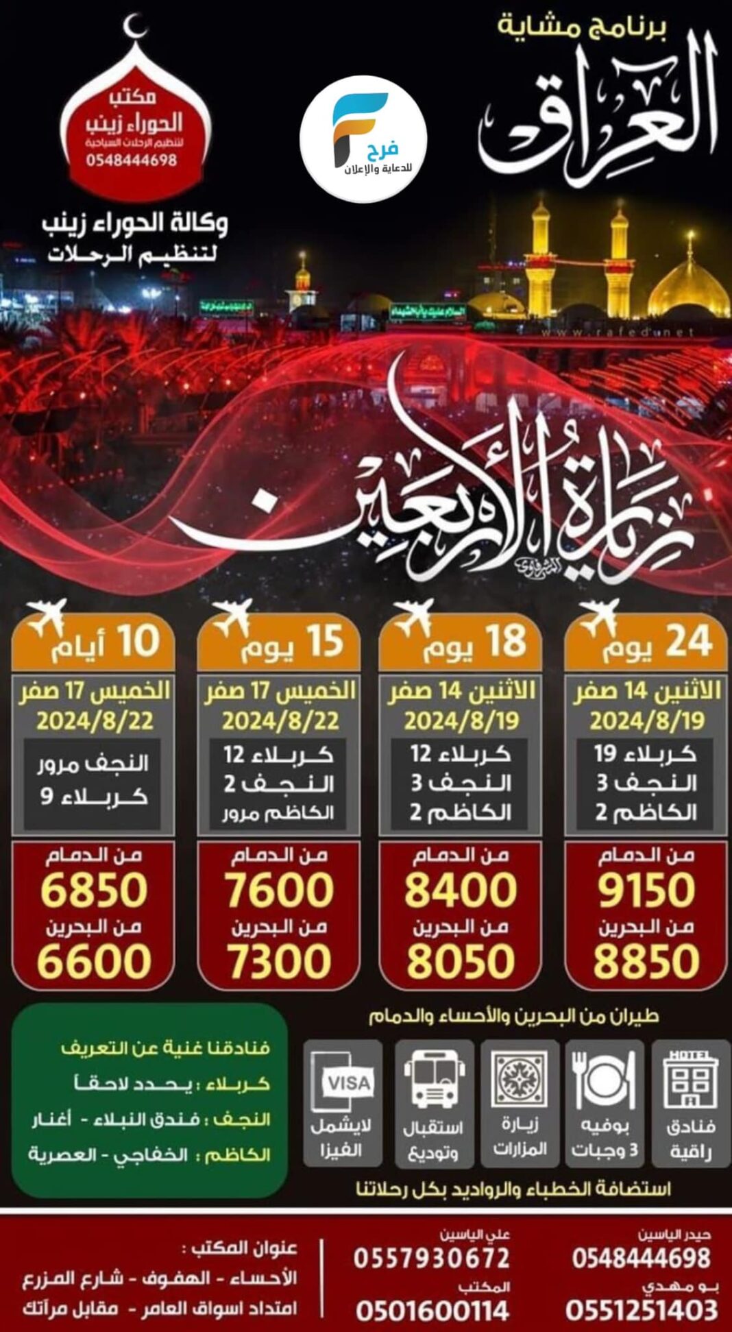 6600 ريال تبدأ رحلات قافلة الحوراء زينب ع زيارة الأربعين / العراق 8 أغسطس، 2024 1 للحجز أو الاستفسار : بو حسين: 0557930672 المكتب: 0501600114 بو علي: 0548444698 بو مهدي: 0551251403 أشترك معنا في خدمة فرح : Enter the text or HTML code here شارك هذا الموضوع: النقر للمشاركة على X (فتح في نافذة جديدة) X انقر للمشاركة على فيسبوك (فتح في نافذة جديدة) فيس بوك معجب بهذه:إعجاب تحميل... مرتبط