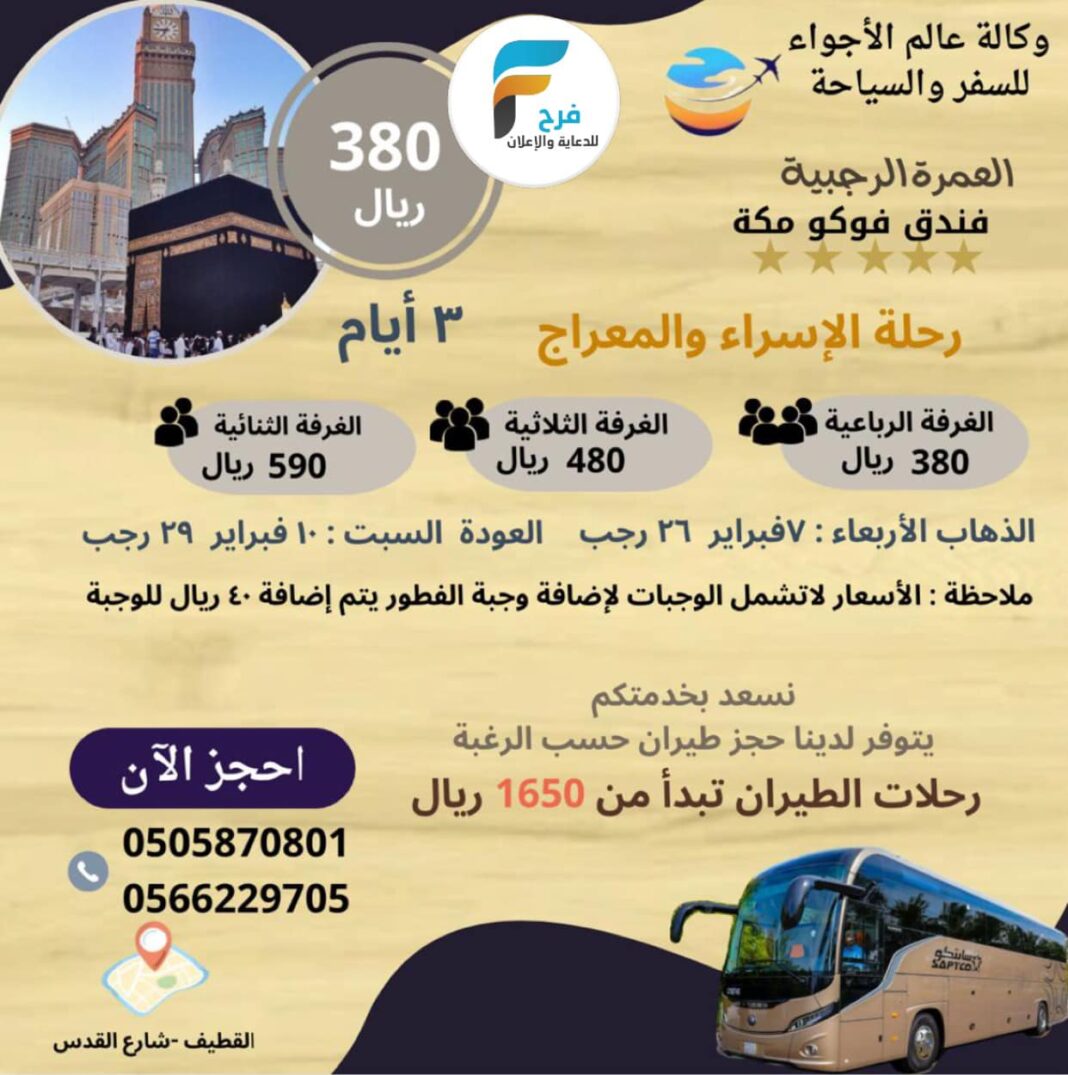 380 ريال تبدأ رحلات الطيران والحافلات وكالة عالم الأجواء / العمرة الرجبية 31 يناير، 2024 1 🌹للحجز والاستفسار🌹 0505870801 0566229705 أشترك معنا في خدمة فرح : Enter the text or HTML code here شارك هذا الموضوع: النقر للمشاركة على X (فتح في نافذة جديدة) X انقر للمشاركة على فيسبوك (فتح في نافذة جديدة) فيس بوك معجب بهذه:إعجاب تحميل... مرتبط