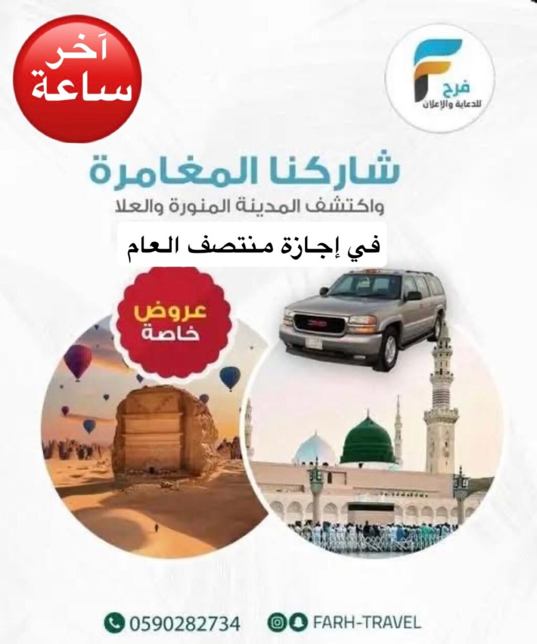 700 ريال رحلة إجازة منتصف العام / المدينة المنورة والعلا 10 يناير، 2026للحجز أو الاستفسار :0590282734حسابات خدمة فرح :-
