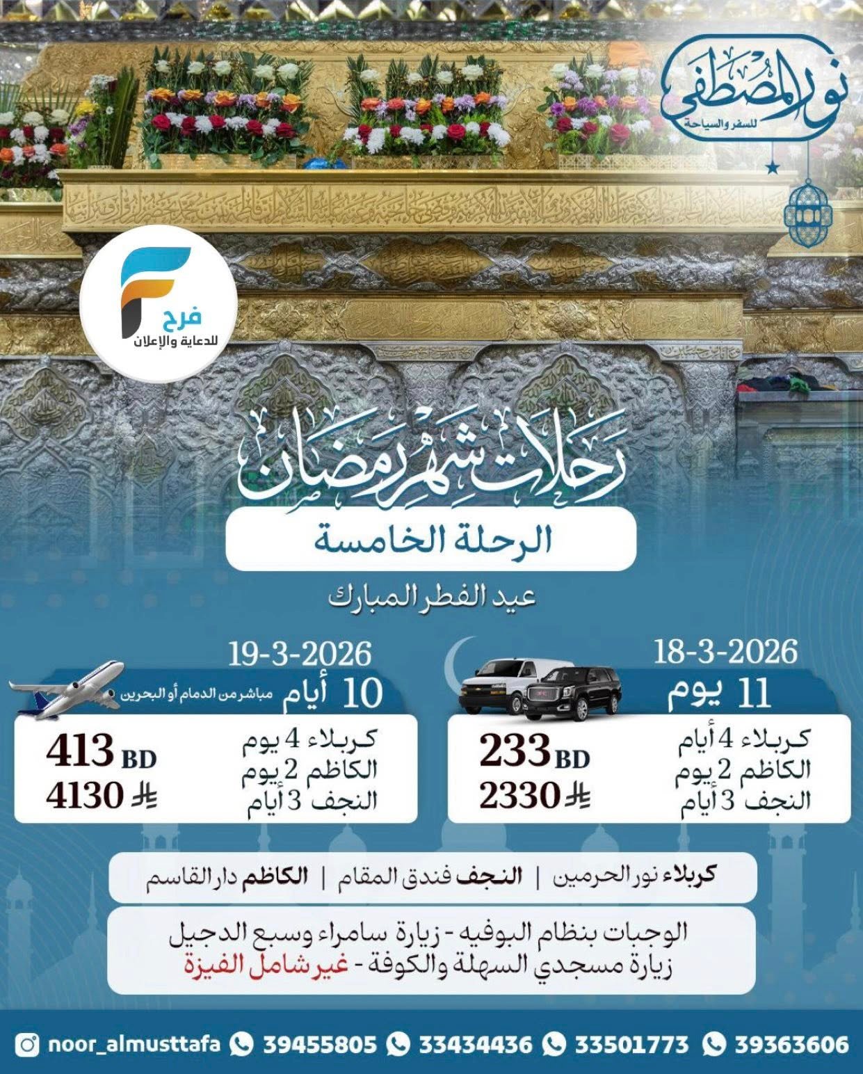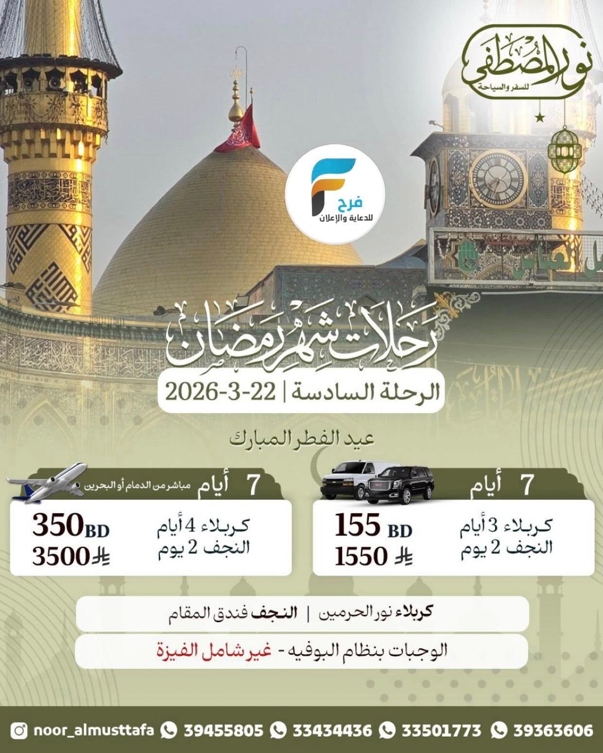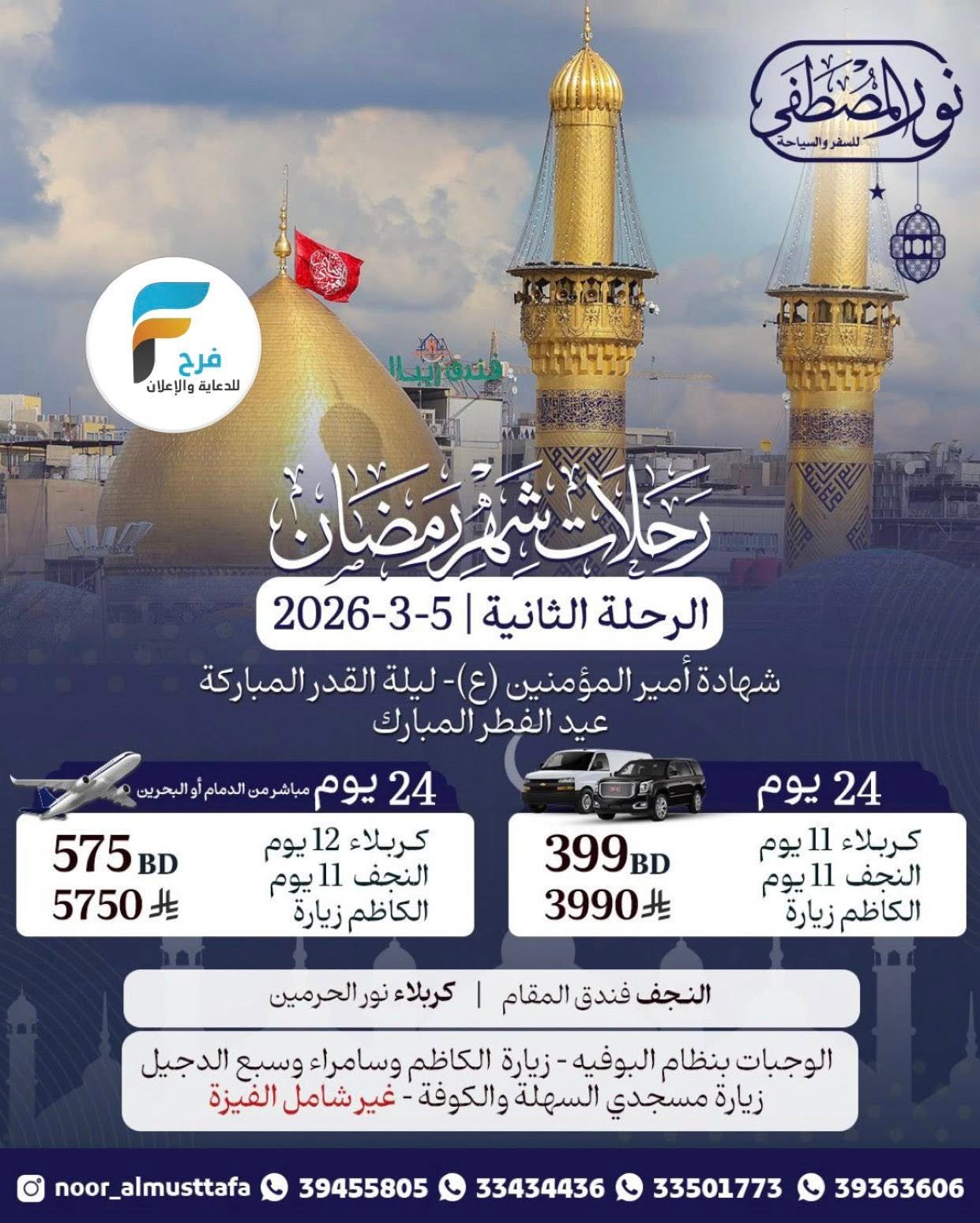 1110 ريال تبدأ رحلات الحافلات والطيران نور المصطفى شهر رمضان / العراق 17 فبراير، 20261للحجز والإستفسار :0097339455805009733343443600973335017730097339363606الانستقرام :-https://www.instagram.com أشترك معنا في خدمة فرح :