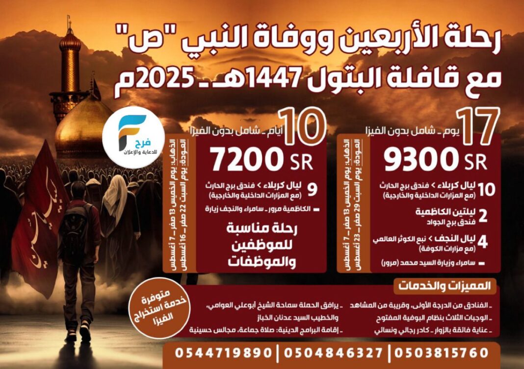 رحلة قافلة البتول زيارة الأربعين ووفاة النبي ص / العراق 14 يوليو، 2025 1 للحجز أو الاستفسار : 0504846327 0503815760 0544719890 أشترك معنا في خدمة فرح : Enter the text or HTML code here شارك هذا الموضوع: النقر للمشاركة على X (فتح في نافذة جديدة) X انقر للمشاركة على فيسبوك (فتح في نافذة جديدة) فيس بوك معجب بهذه:إعجاب تحميل... مرتبط