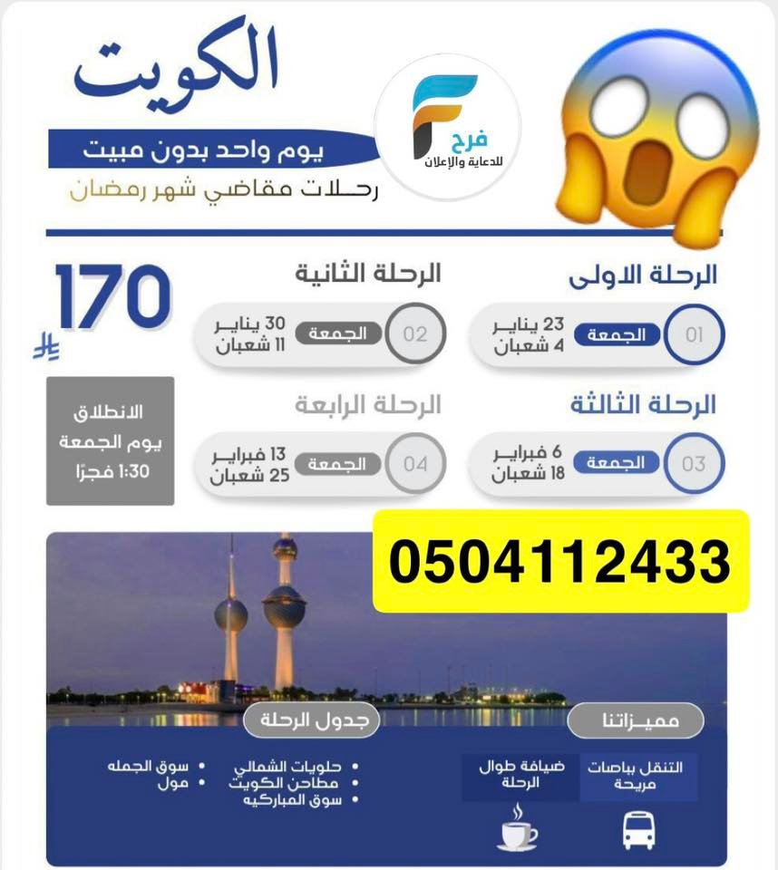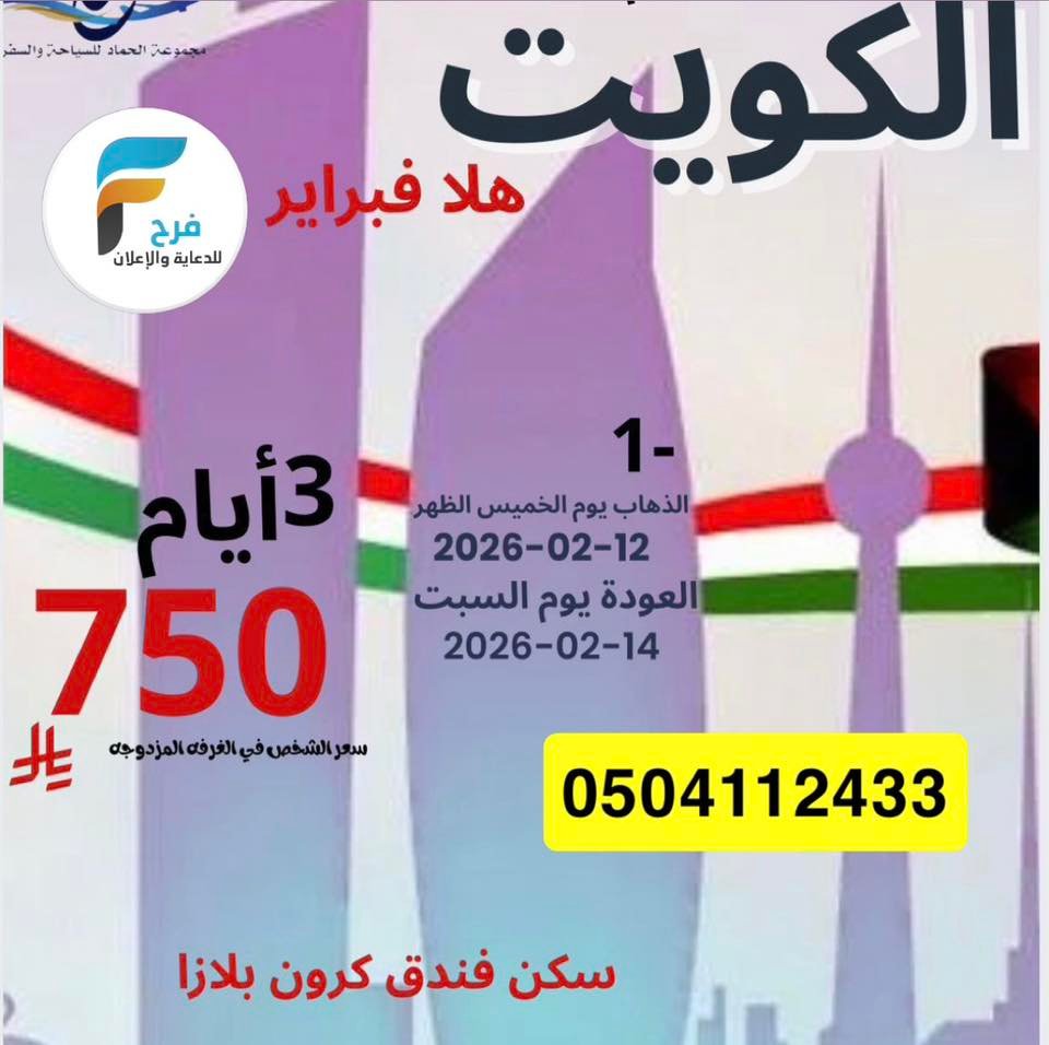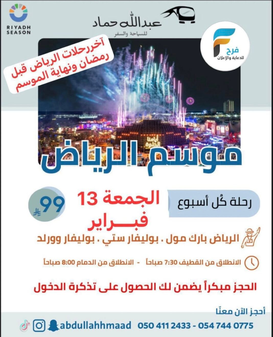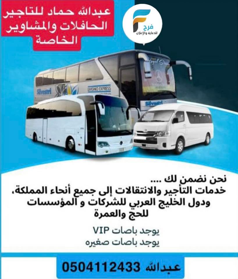 99 ريال تبدأ رحلات قافلة عبدالله حماد – كما نوفر لكم باصات صغيرة و VIP للايجار / الرياض – الكويت 9 فبراير، 2026للحجز و الاستفسار :عبدالله حماد:0504112433للنساء:0547440775تاروت سيد حسين :0501919816: سناب شاتhttps://www.snapchat.com : الانستقرامhttps://www.instagram.comأشترك معنا في خدمة فرح :