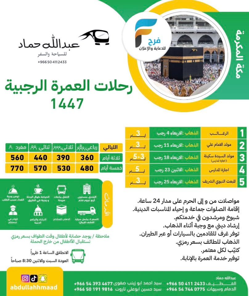 85 ريال تبدأ رحلات قافلة عبدالله حماد / الرياض – الكويت – البحرين – العمرة الرجبية 30 نوفمبر، 2025 للحجز و الاستفسار : عبدالله حماد: 0504112433 للنساء: 0547440775 تاروت سيد حسين : 0501919816 : سناب شات https://www.snapchat.com : الانستقرام https://www.instagram.com/ أشترك معنا في خدمة فرح : شارك هذا الموضوع: النقر للمشاركة على X (فتح في نافذة جديدة) X انقر للمشاركة على فيسبوك (فتح في نافذة جديدة) فيس بوك معجب بهذه:إعجاب تحميل... مرتبط