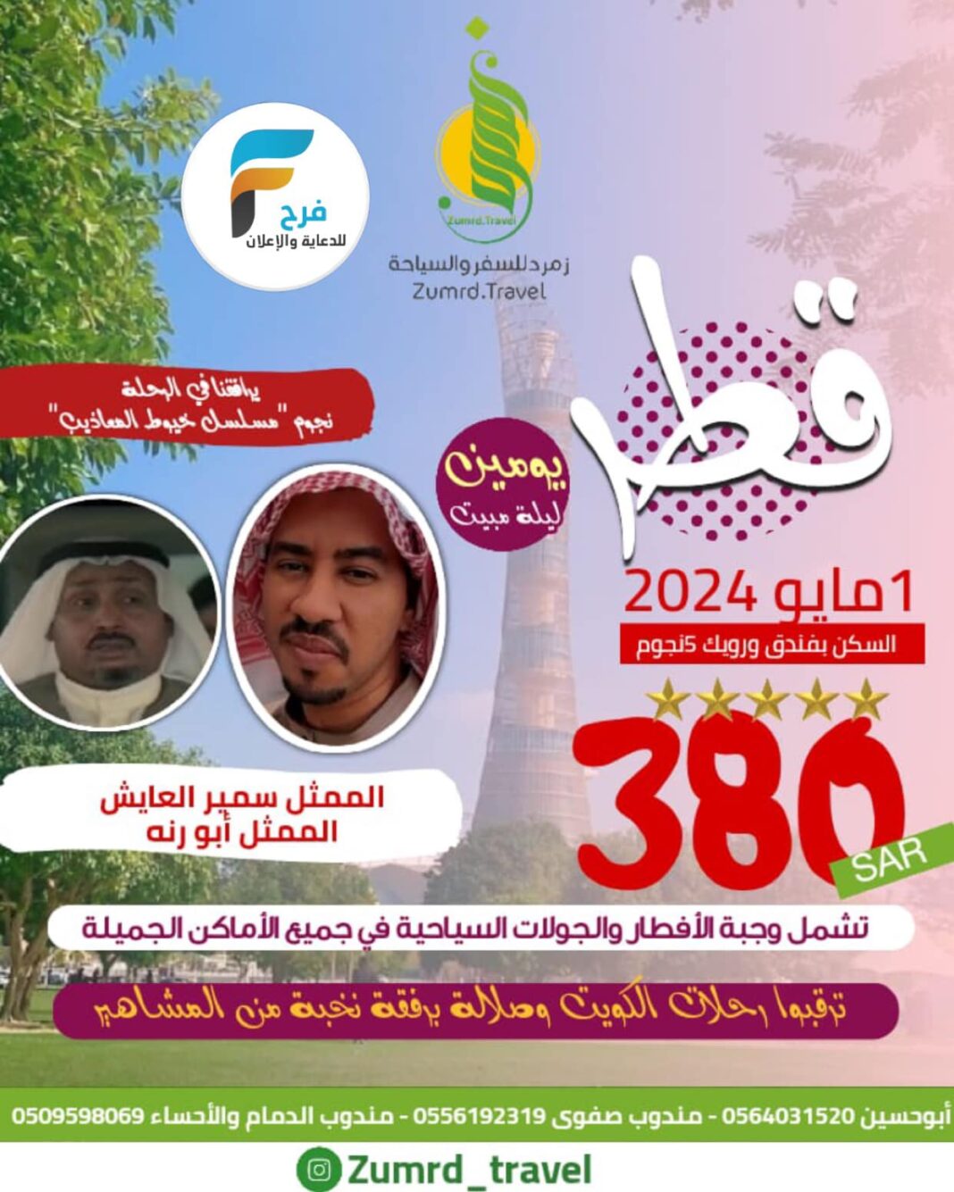 380 ريال تبدأ رحلات زمرد للسفر والسياحة / قطر – الكويت – دبي – عمان 9 مايو، 2024 1 للحجز أو الاستفسار : أبو حسين: 0564031520 مندوب صفوى : 0556192319 مكتب الدمام والاحساء : 0509598069 الانستقرام: https://www.instagram.com/ أشترك معنا في خدمة فرح : Enter the text or HTML code here شارك هذا الموضوع: النقر للمشاركة على X (فتح في نافذة جديدة) X انقر للمشاركة على فيسبوك (فتح في نافذة جديدة) فيس بوك معجب بهذه:إعجاب تحميل... مرتبط