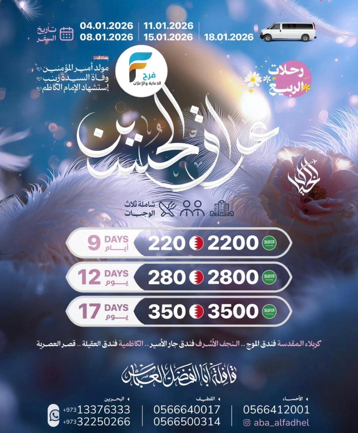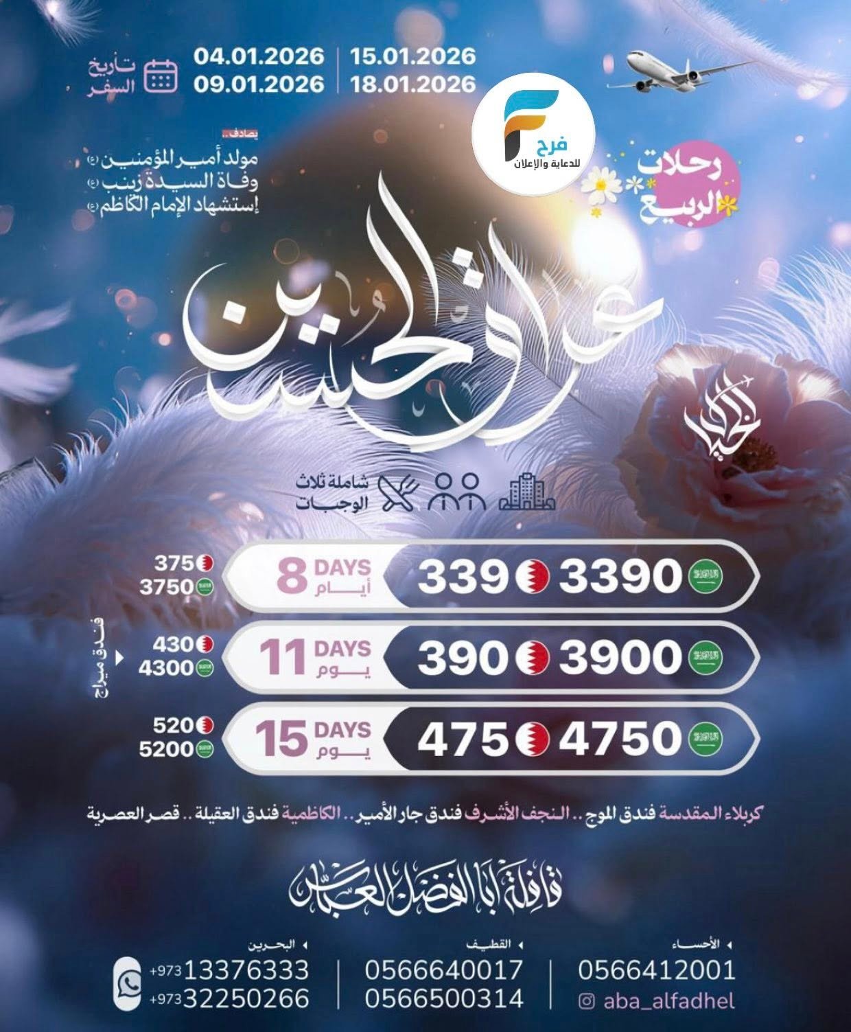 2200 ريال تبدأ رحلات الحافلات والطيران قافلة ابا الفضل العباس إجازة منتصف العام / العراق 13 ديسمبر، 2025 925/12/09 للحجز أو الاستفسار : القطيف: 0558335297 0566500314 0566640017 0544696477 0566285623 الاحساء: 0566412001 0501908993 البحرين:0097313376333 0097332250266 انستغرام : Aba_alfadhel فيس بوك / قافلة ابا الفضل العباس سناب / https://www.snapchat.com أشترك معنا في خدمة فرح : شارك هذا الموضوع: النقر للمشاركة على X (فتح في نافذة جديدة) X انقر للمشاركة على فيسبوك (فتح في نافذة جديدة) فيس بوك معجب بهذه:إعجاب تحميل... مرتبط