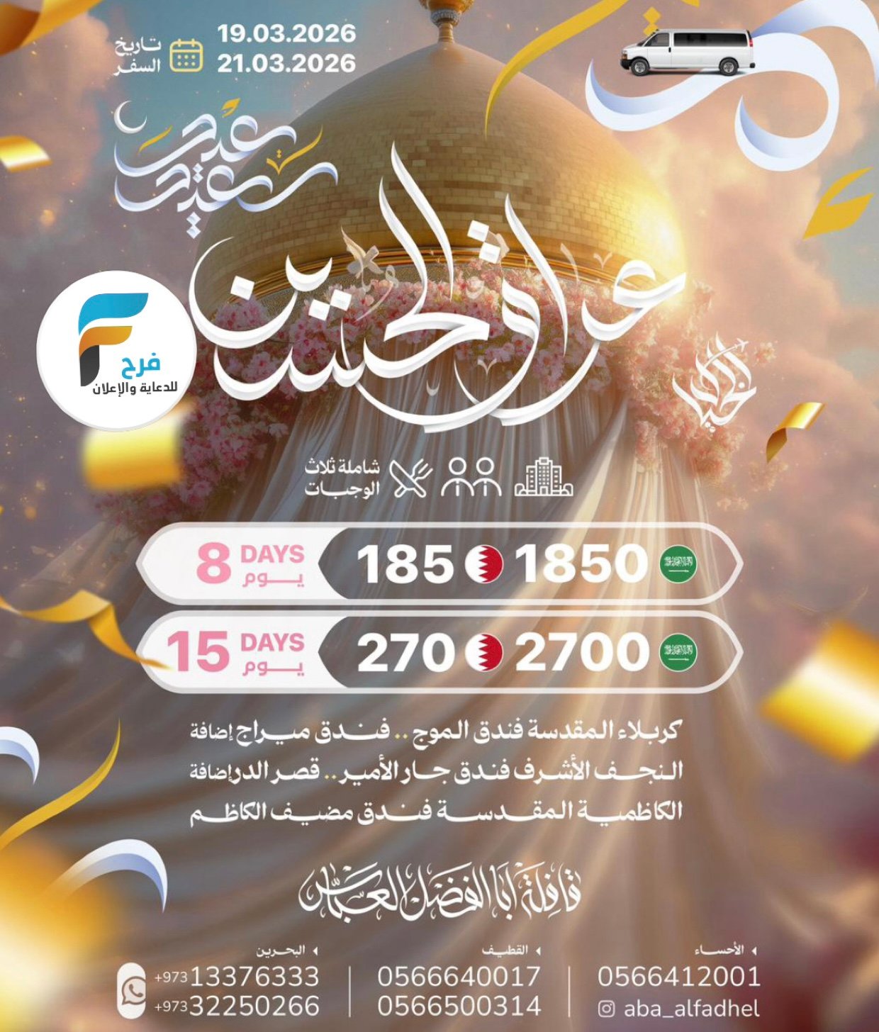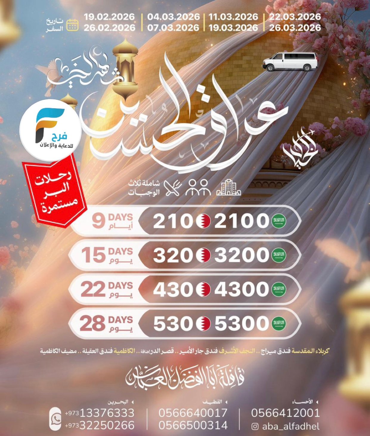 1850 ريال تبدأ رحلات البر قافلة ابا الفضل العباس العيد / العراق 15 مارس، 20261226/3/15للحجز أو الاستفسار :القطيف:05583352970566500314056664001705446964770566285623الاحساء:05664120010501908993البحرين:00973133763330097332250266انستغرام :Aba_alfadhelفيس بوك / قافلة ابا الفضل العباس سناب /https://www.snapchat.comأشترك معنا في خدمة فرح :