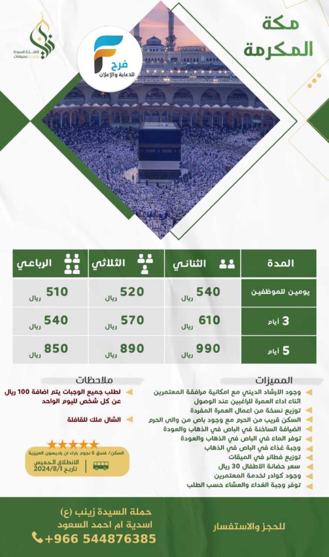 510 ريال تبدأ رحلات حملة السيدة زينب ع / مكة المكرمة 28 يوليو، 2024 2 للحجز والاستفسار :- 0544876385 أشترك معنا في خدمة فرح : Enter the text or HTML code here شارك هذا الموضوع: النقر للمشاركة على X (فتح في نافذة جديدة) X انقر للمشاركة على فيسبوك (فتح في نافذة جديدة) فيس بوك معجب بهذه:إعجاب تحميل... مرتبط