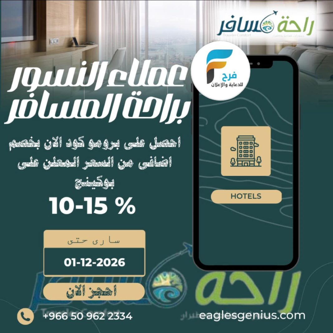 15% خصم حجوزات الفنادق راحة مسافر 2 يونيو، 2024 لم 1 للحجز والاستفسار : 0509622334 أشترك معنا في خدمة فرح : Enter the text or HTML code here شارك هذا الموضوع: النقر للمشاركة على X (فتح في نافذة جديدة) X انقر للمشاركة على فيسبوك (فتح في نافذة جديدة) فيس بوك معجب بهذه:إعجاب تحميل... مرتبط